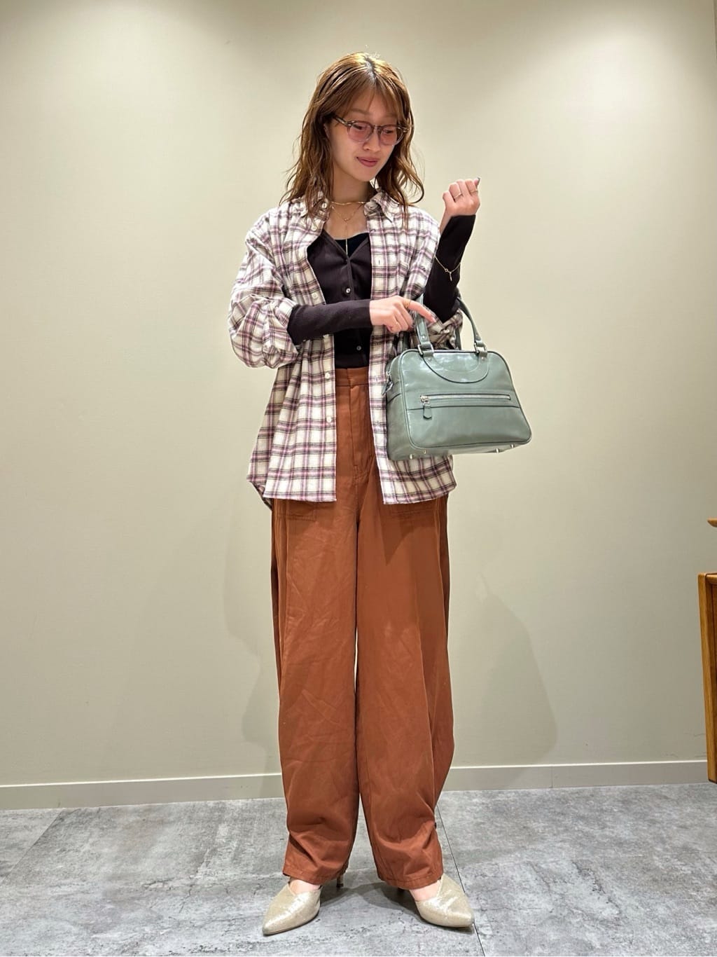 インナーのブラウンで引き締めつつ、パンツやバッグでコーディネートに柔らかさをプラス。
