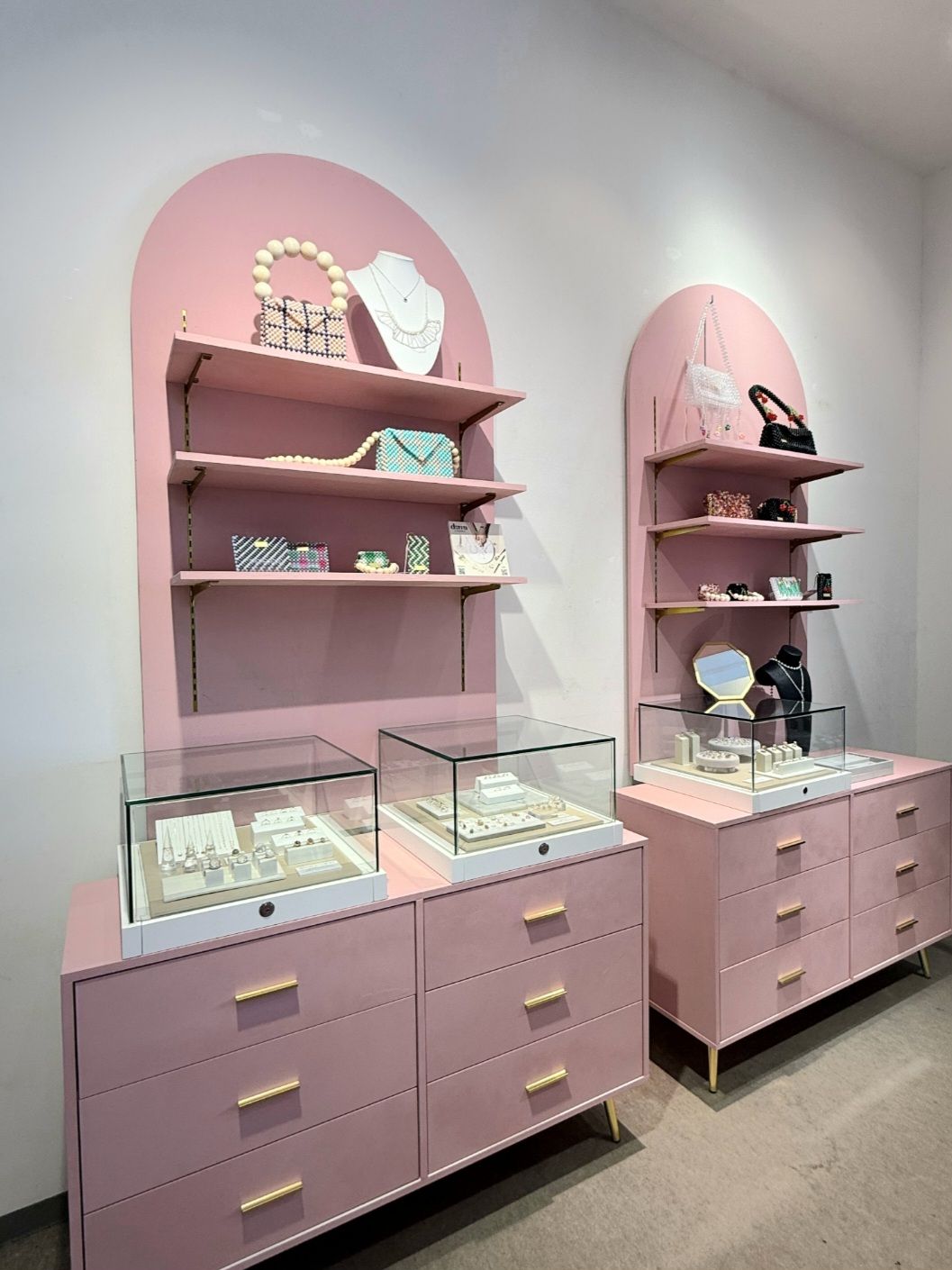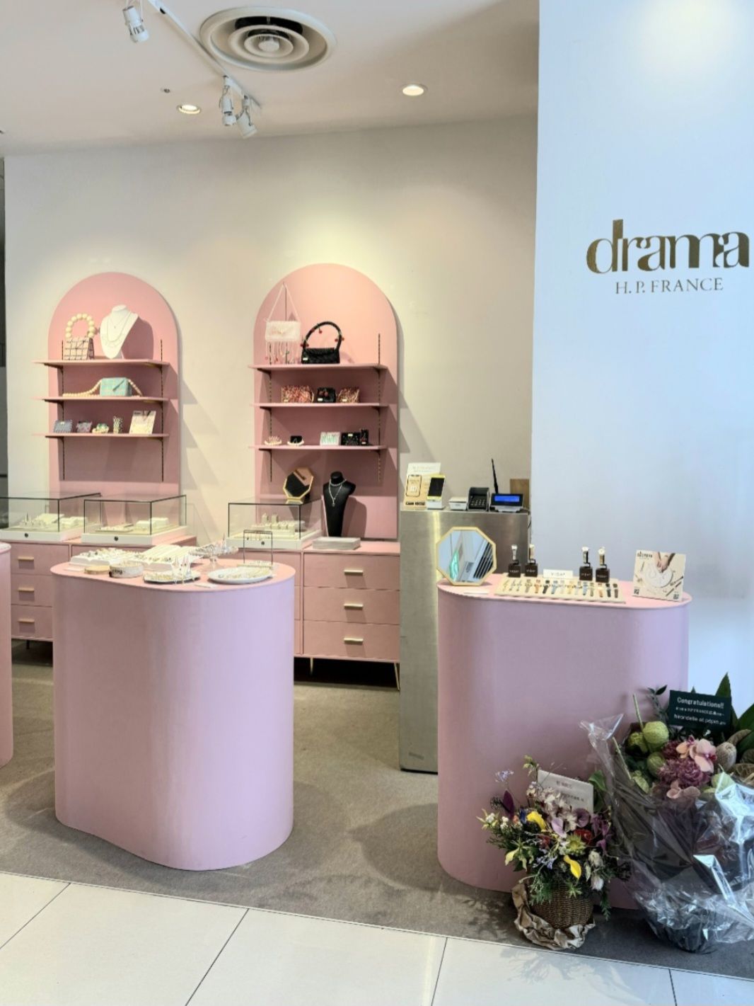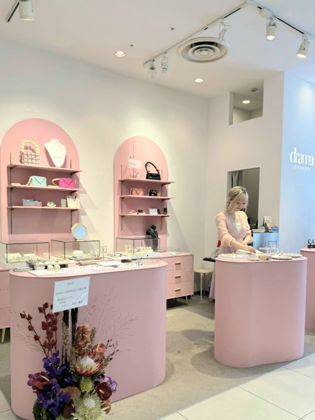 店内に一歩足を踏み入れると、淡いピンクカラーとゴールドのコントラストで作られた、かわいくも洗練された雰囲気が目の前を通る人々を引き付けます。沢山の”好き”が詰まっているこの空間には、“Creators Jewelry Incubation Shop”をコンセプトに、新しく生まれるクリエイションをdramaの審美眼で選び抜いたジュエリーたちが並びます。