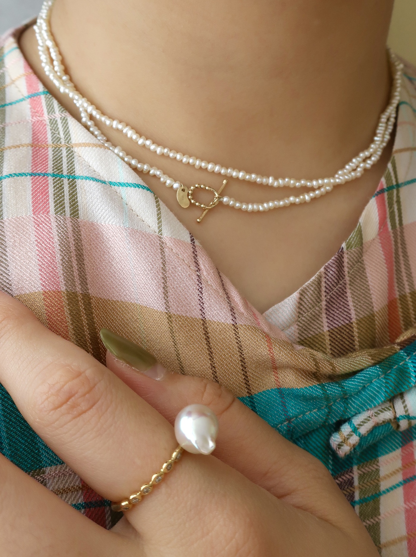 小さな淡水パールを連ねたロングネックレスは色々なコーディネートに重宝しそうです。