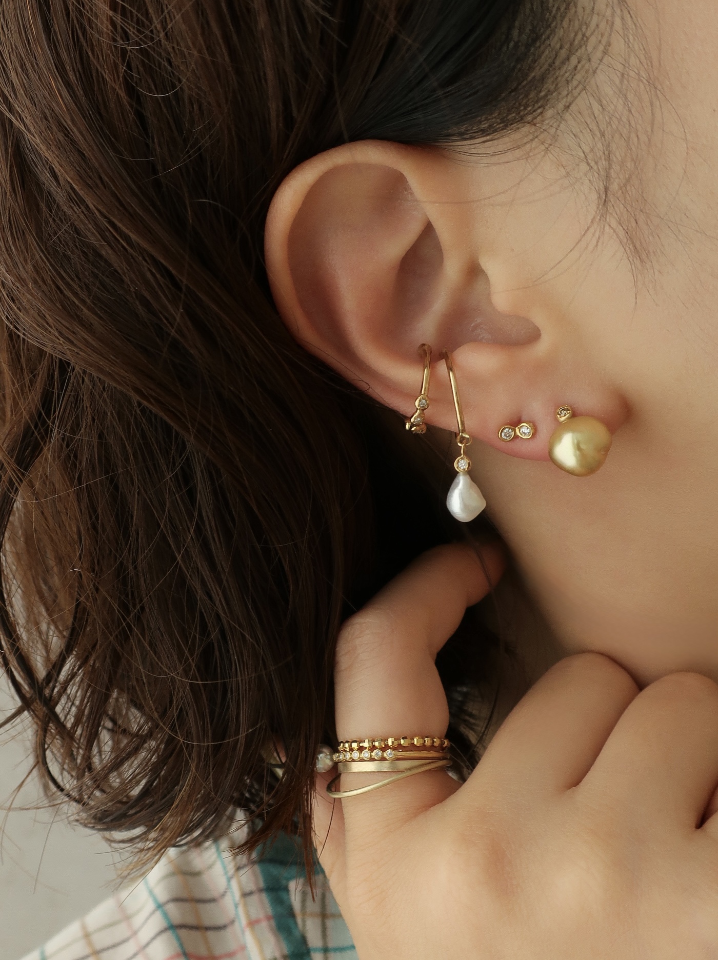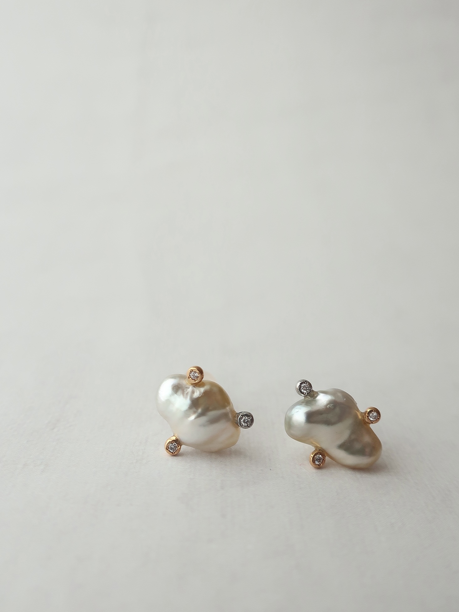 歪んだパールに小さなダイヤモンドをあしらった、リズムを感じるピアスはつけると明るい気分にしてくれそうです。