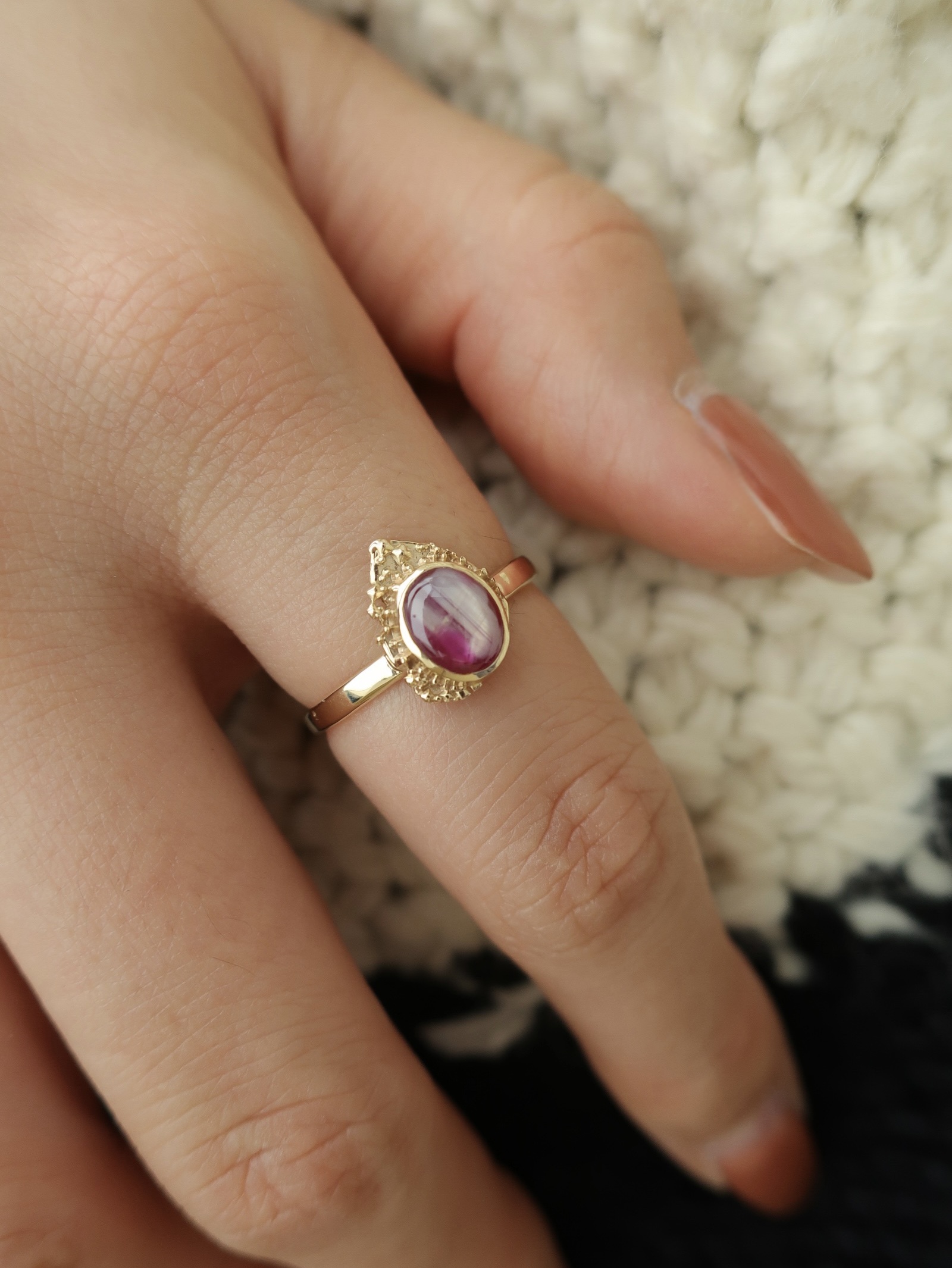 奇跡のようなカラーのバイカラールビー。指先に花びらが舞いおりました。