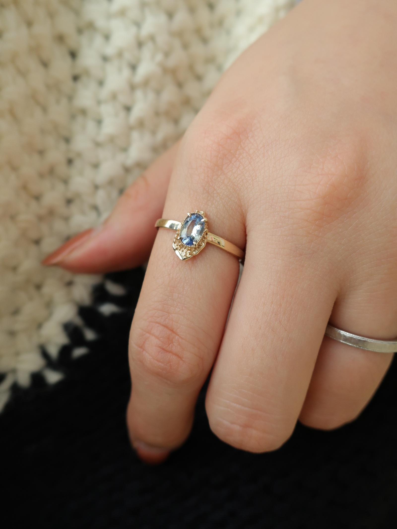 クリアとブルーのバイカラーサファイア。淡い青色のきらめく石は冬の訪れを感じます。