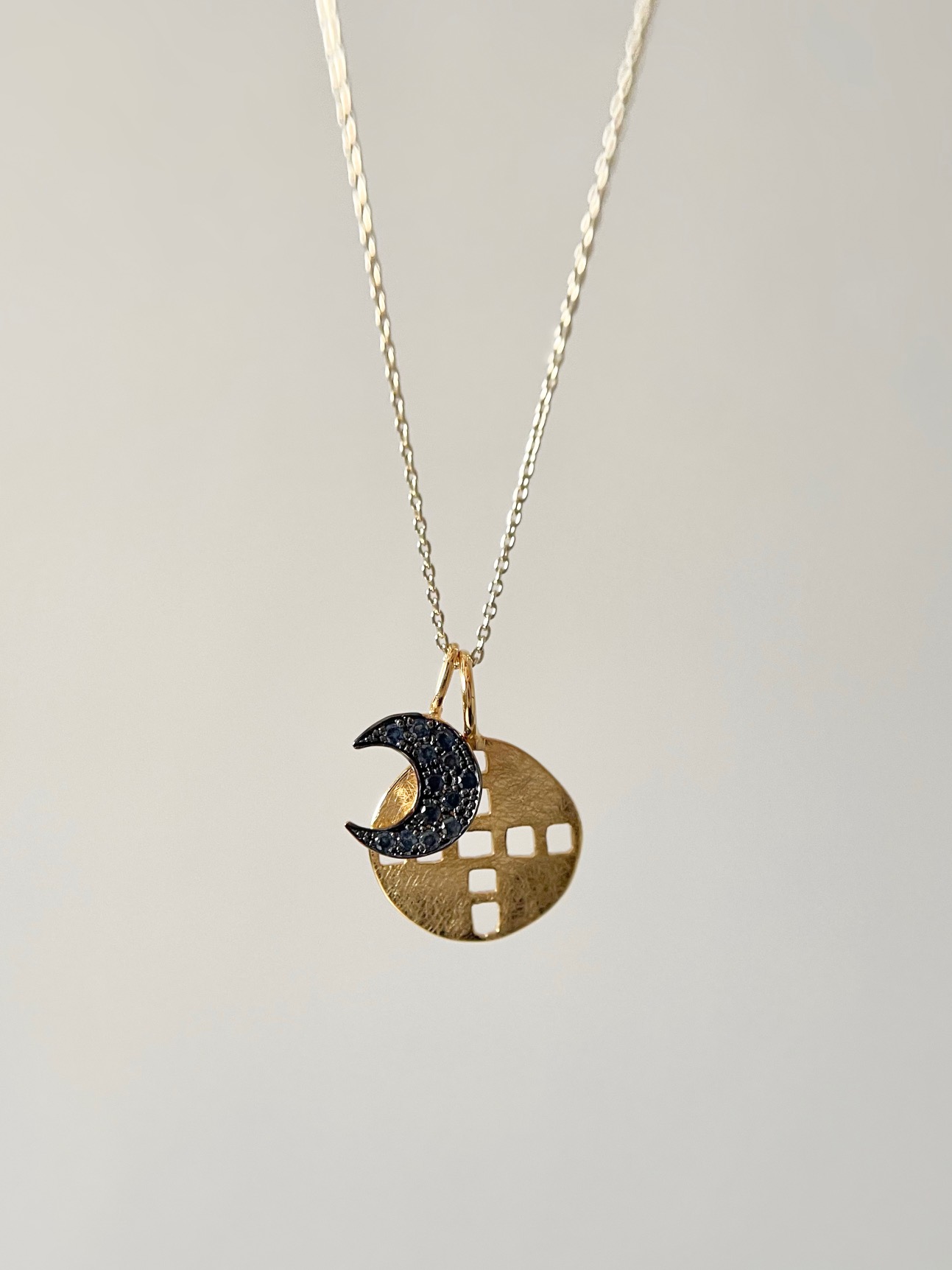 ブラックロジウム×ブルーサファイアのクールなコントラストが魅力的な三日月ネックレスには、スクエアフォールで描かれるクロスチャームを。