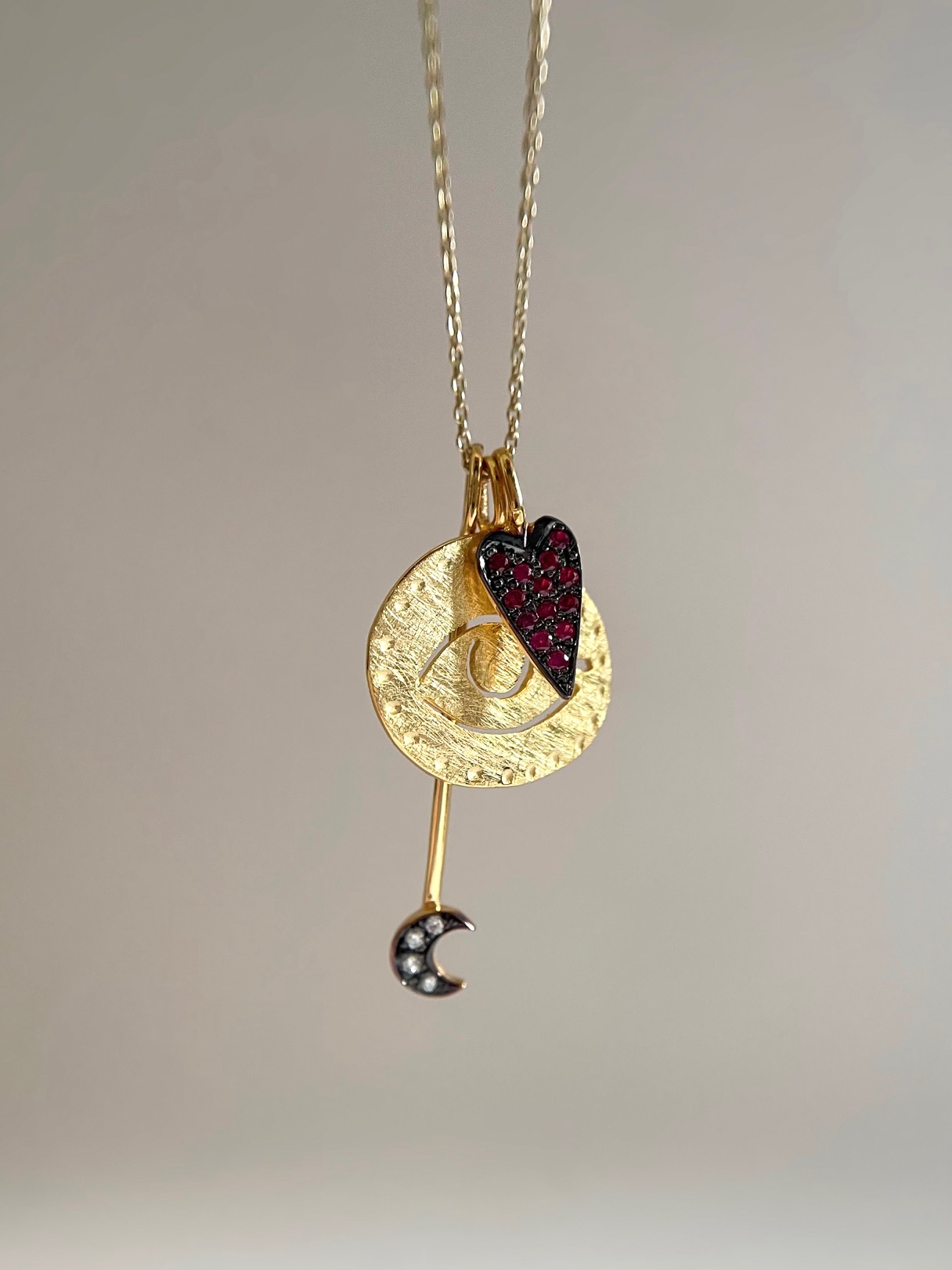 縦長のシャープなハートチャームは、ブラックロジウムとルビーのコンビネーションがモードな雰囲気。Evil Eye ネックレスの下から覗く三日月チャームにはホワイトダイヤモンドが輝きます。