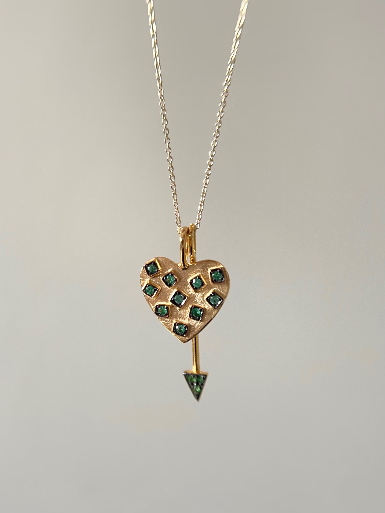ファーストシーズンから人気のハートネックレスには、ツァボライトが美しい矢のモチーフを合わせ、ハートを射抜く情熱的な組み合わせがおすすめです。