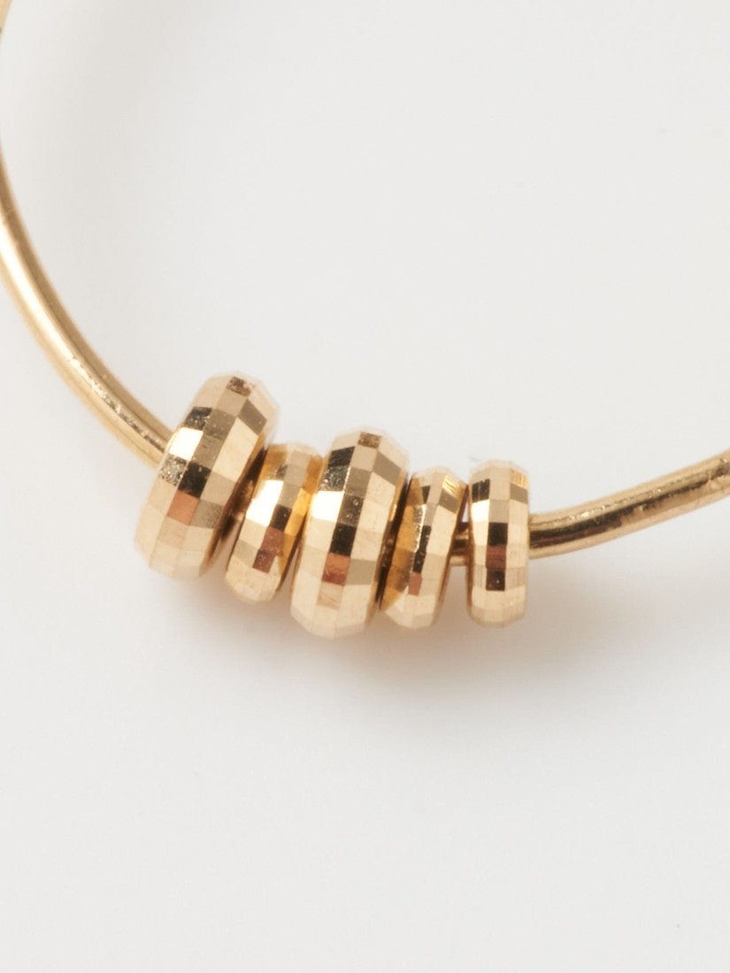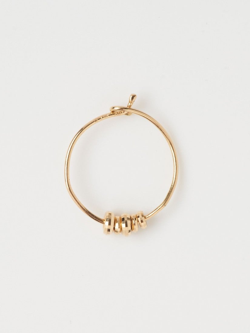 まるでドーナツのような大小さまざまな形のパーツが付いたシングルピアス。パーツ側面には平面のカットが施されミラーボールのような輝きがポイント。
