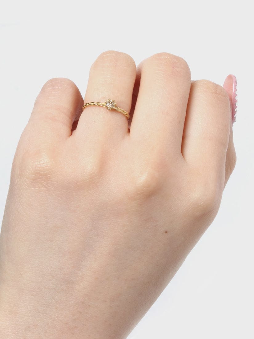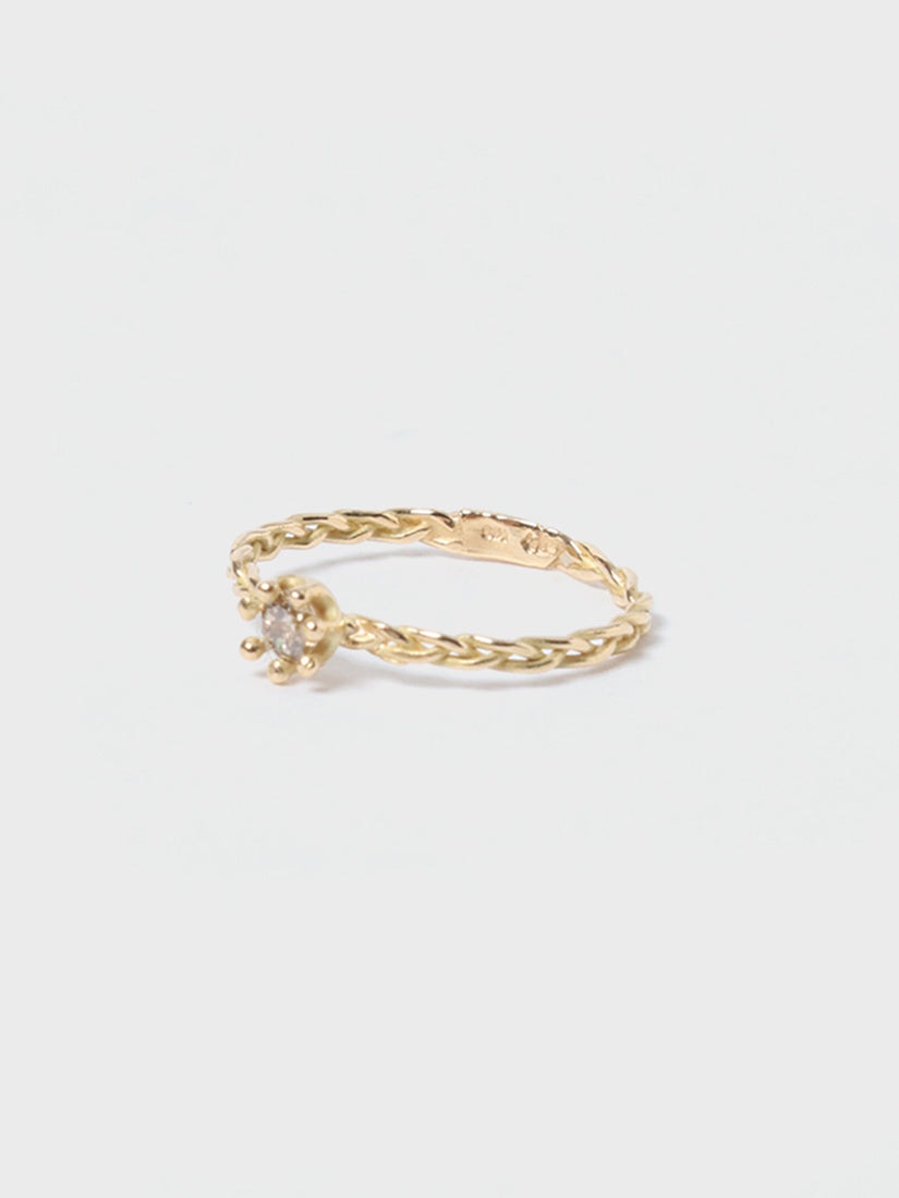 一滴のミルクを落としてできた、王冠状の波紋をイメージしたリング。つやっとした小粒のボールがダイアモンドを囲むアートのようなデザイン。ゴールドを編み込んだような繊細アームもポイントです。