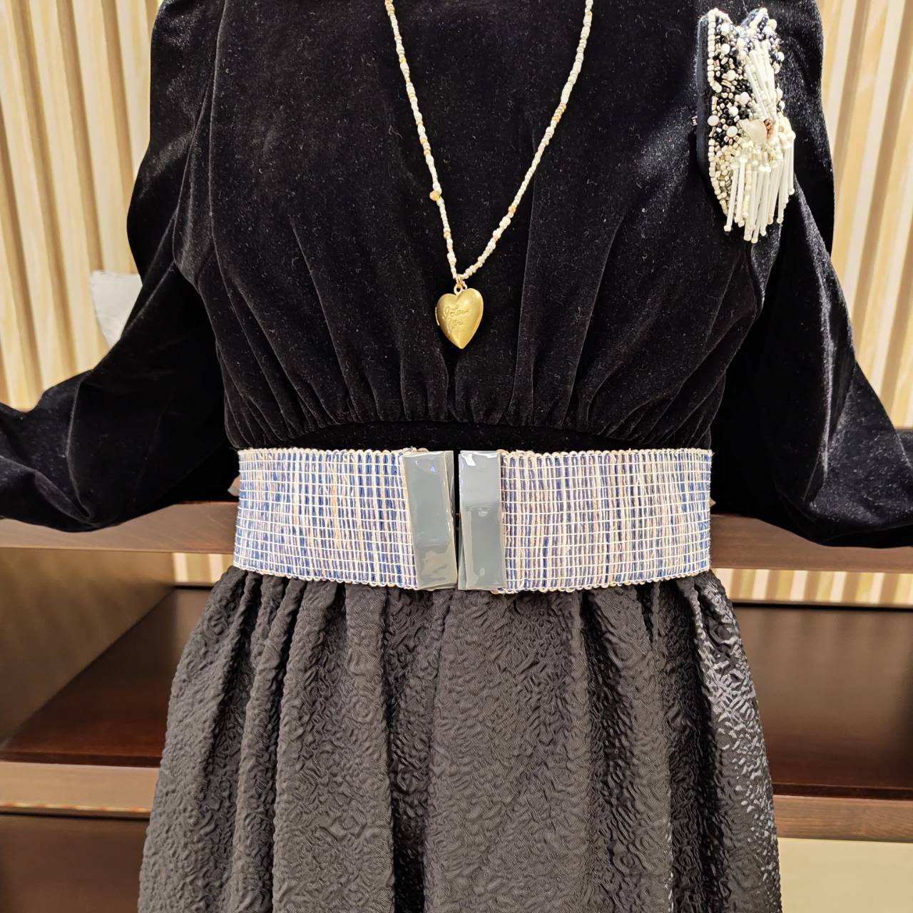 深みのあるブルーグレーのエナメルバックルは上品な輝きを放ちます。リネンとウールを織り交ぜたオーガニックな編み地は幅広くウエストマークにインパクトを与えてくれるでしょう。