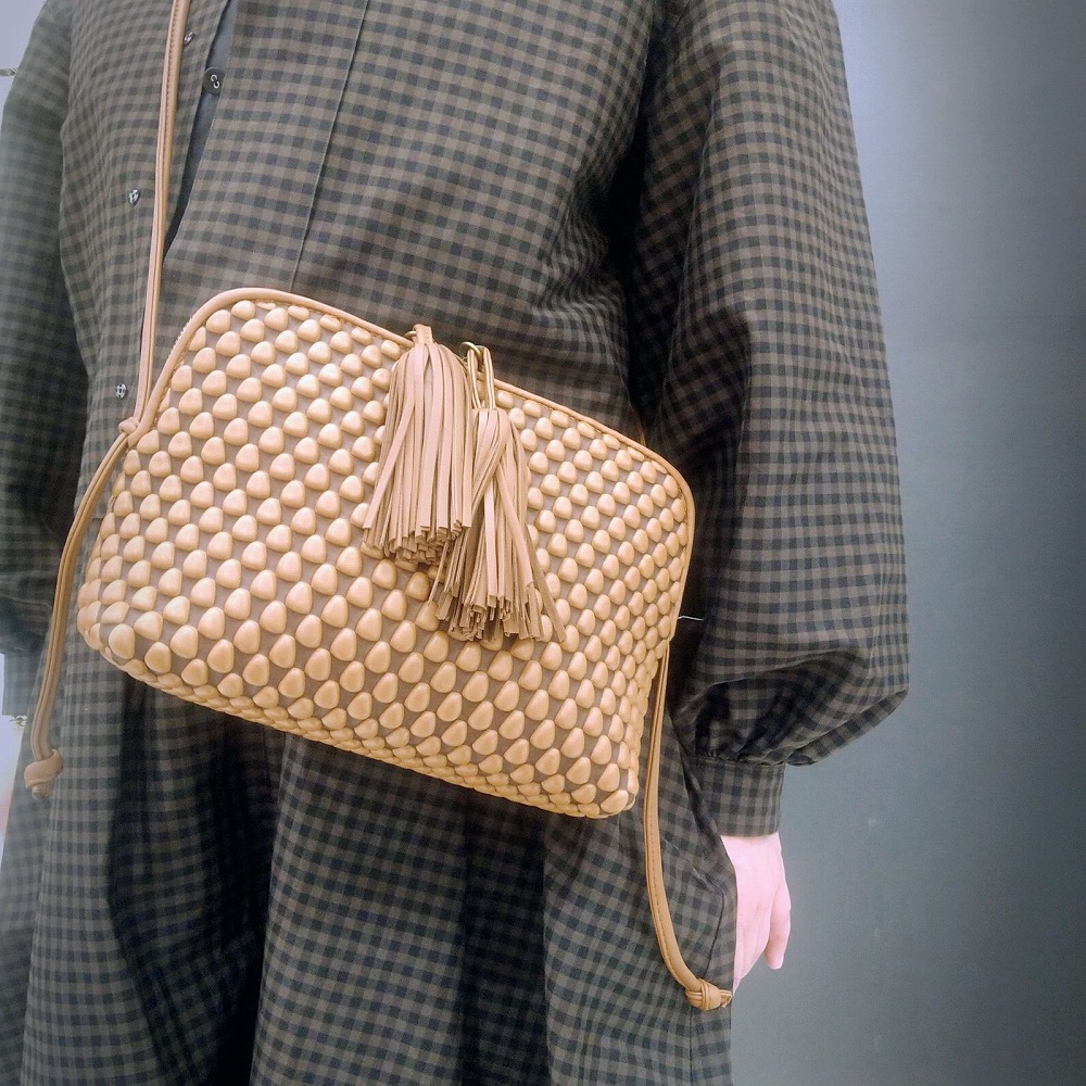 立体的なテクスチャーとタッセルのデザインが印象的で、深みのあるブラウンが上質な存在感を放ちます。シンプルな装いにひとつ加えるだけで、柔らかくも洗練された秋のスタイルを完成させます。