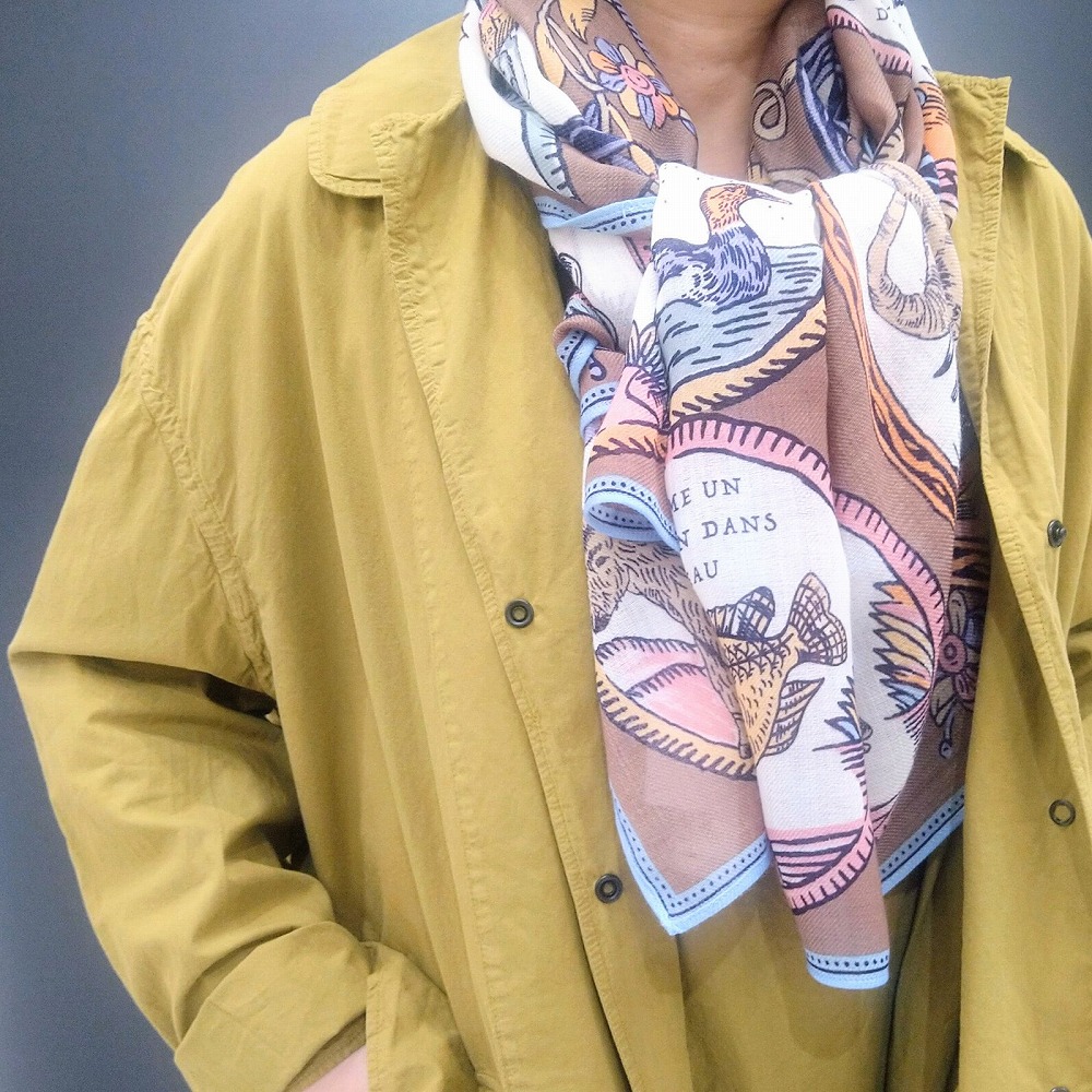 ウール素材の柔らかさに、幸運と幸福を象徴するモチーフを散りばめたスカーフ。クローバーや動物たちが丸いフレームの中で軽やかに舞うように描かれ、見ているだけで心が弾むデザインです。ひとつひとつのモチーフに願いが込められ、身にまとう人にポジティブなエネルギーをもたらします。