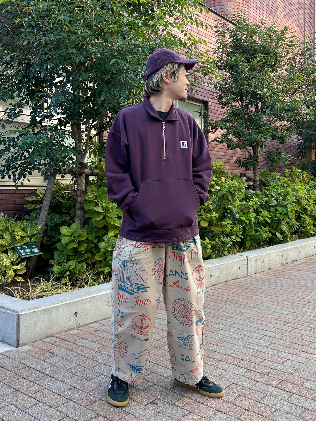ハーフジップスウェットのゆったりとしたシルエットが、リラックスしたムードを演出。