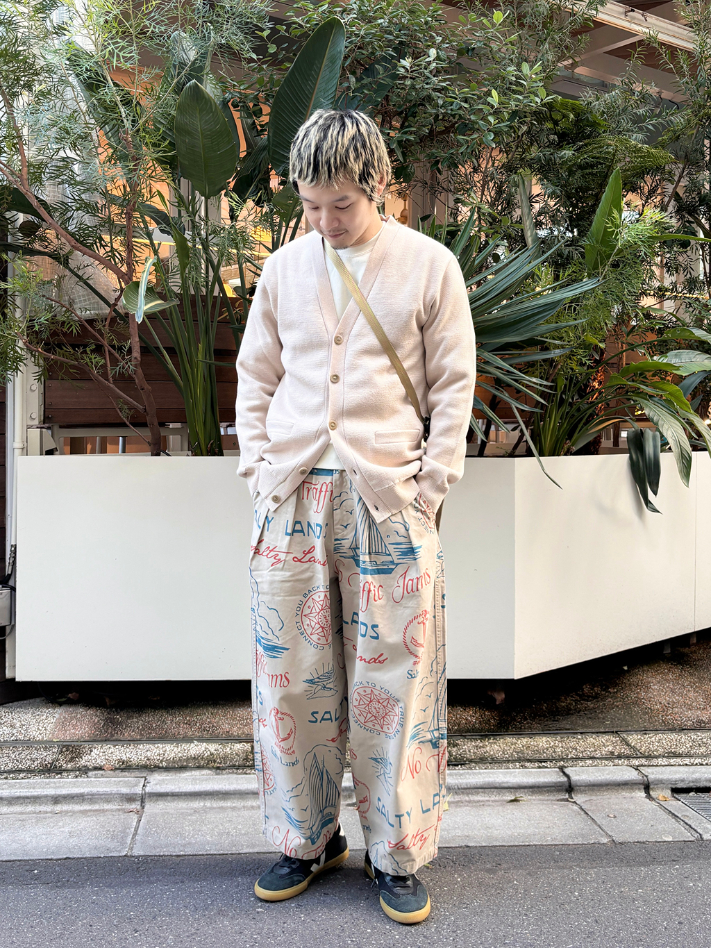深みのあるプラムカラーのトップスに、マリンプリントが目を惹くパンツを合わせた秋のOLOWスタイル。