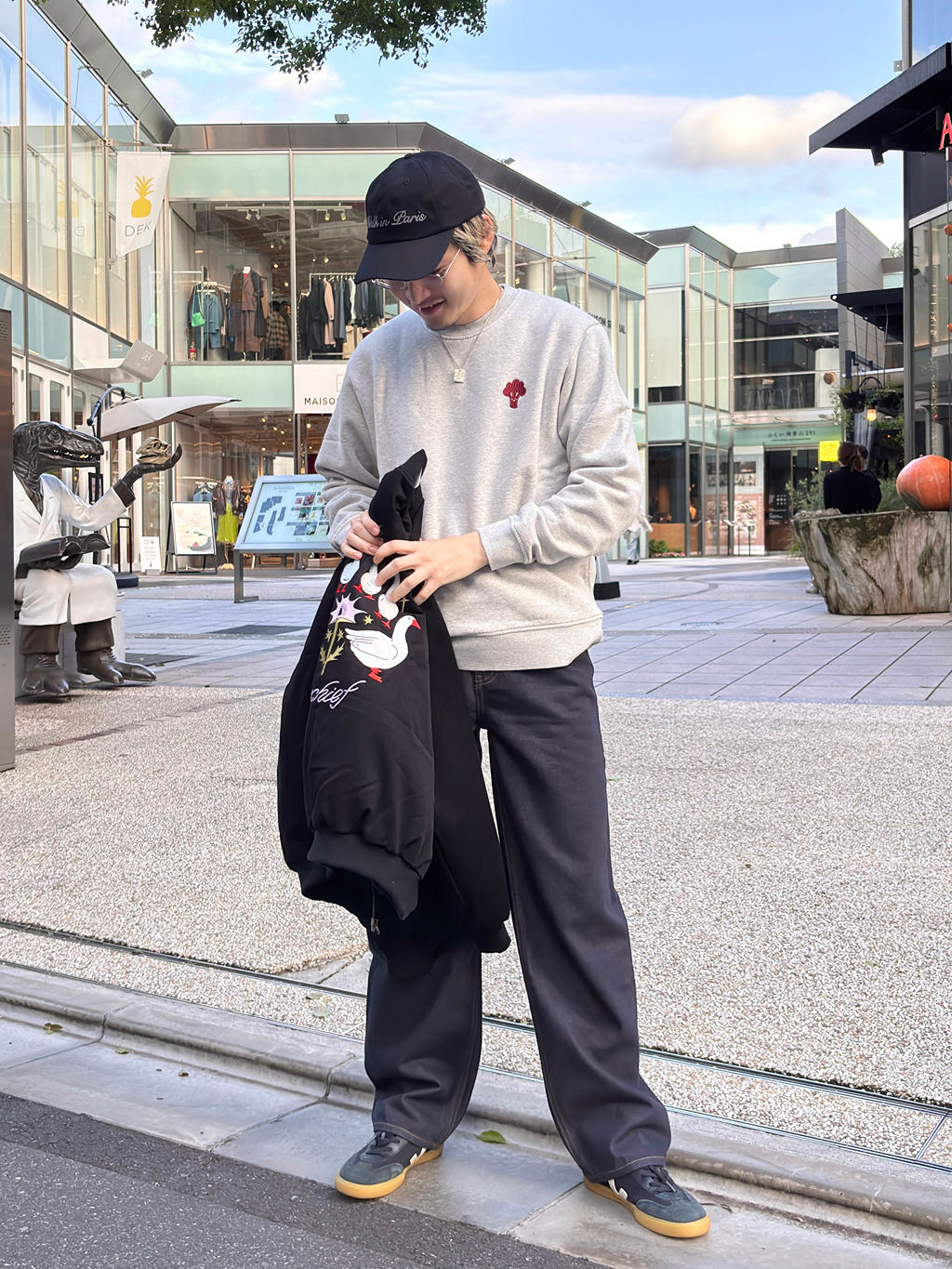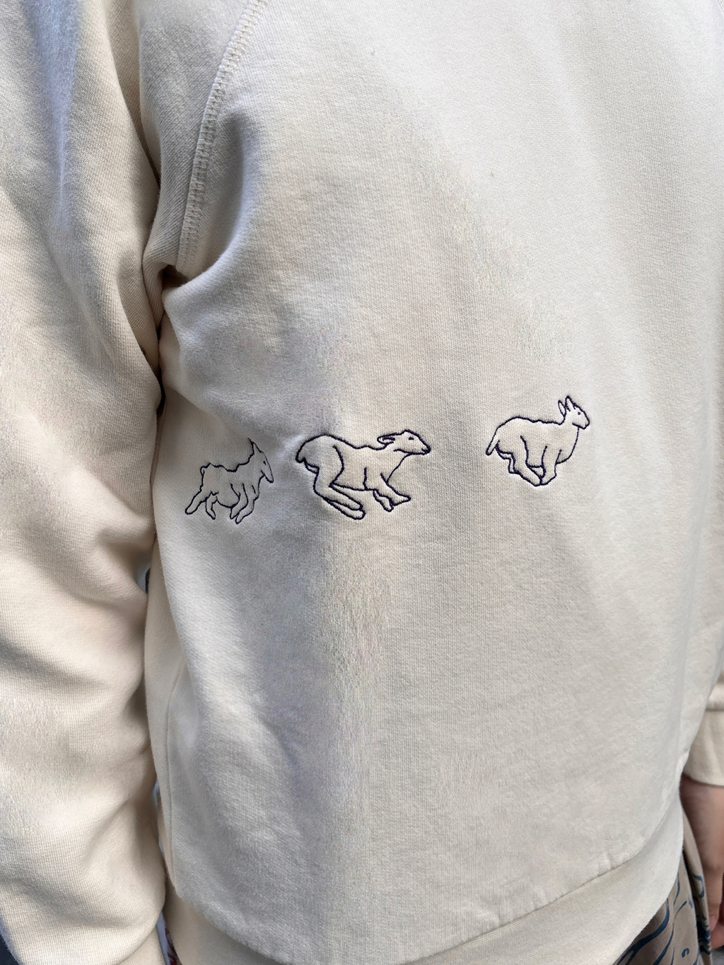 レイヤードしたスウェットには、走るヤギの刺繍がサイドに入ったユニークなデザイン。ほっこりと穏やかな気持ちになれるアイテムです。