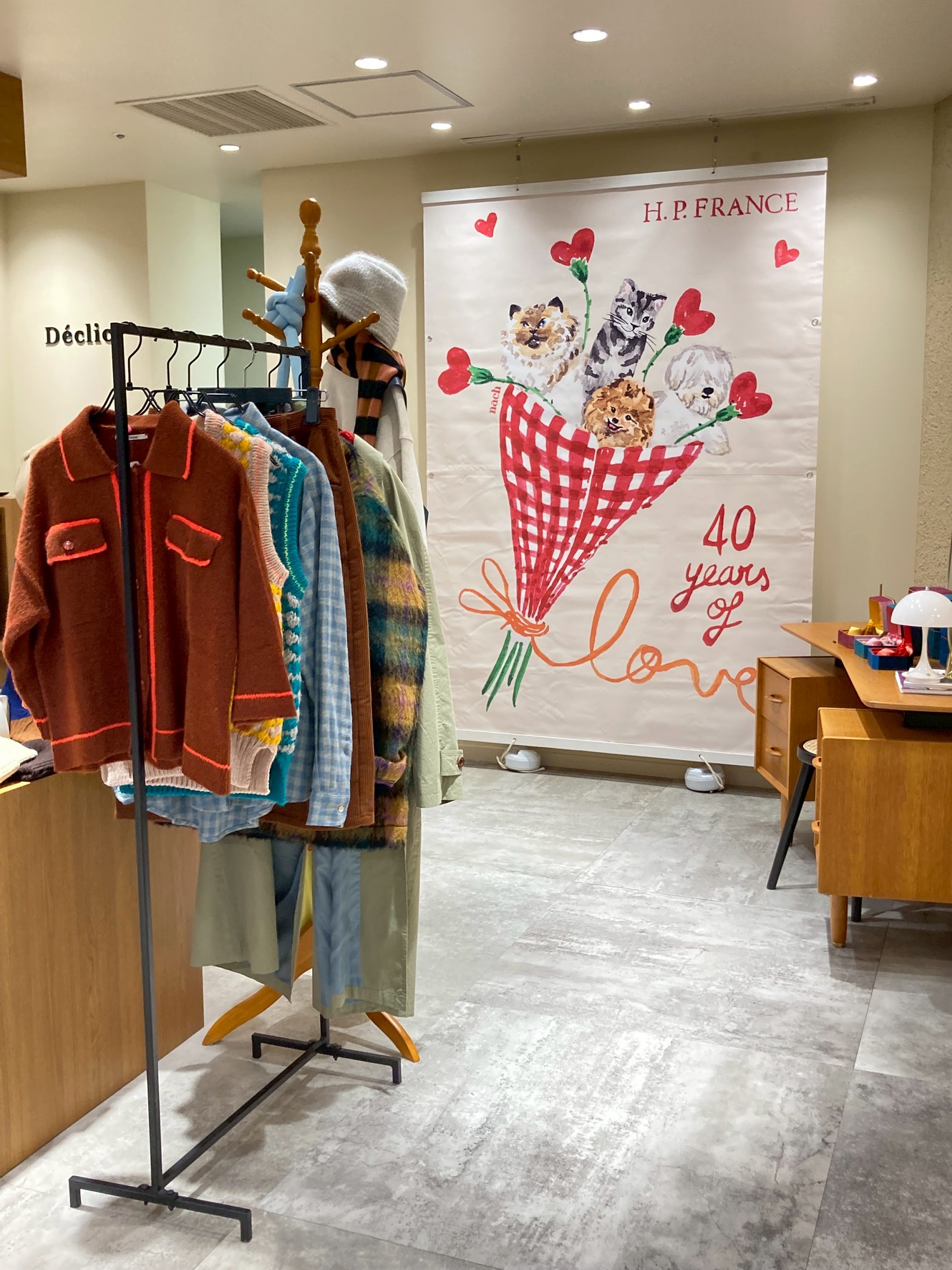 今回ご紹介したNACHにはH.P.FRANCE40周年をオマージュした4輪のハートのお花と愛らしい動物たちが花束になったイラストも描き下ろしていただきました!店内にも大きなタペストリーとして飾り付けしておりますので、是非イラストもチェックしてみてください。