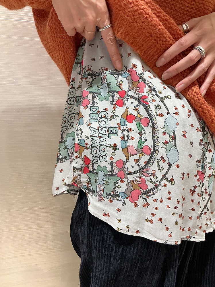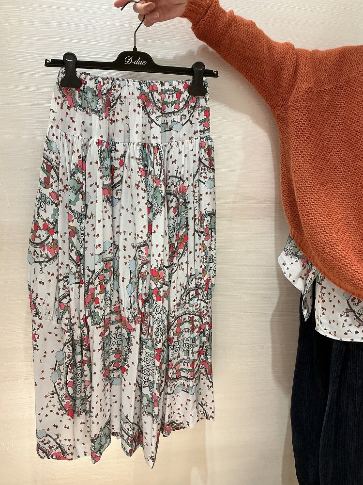 今回のコレクションでは落ち感のあるレーヨン素材を使用しているので、D-dueのラインアップの中ではめずらしい、すっきりとしたシルエット。同じイラストをプリントしたスカートも軽やかな素材感で様々な季節に楽しめます。