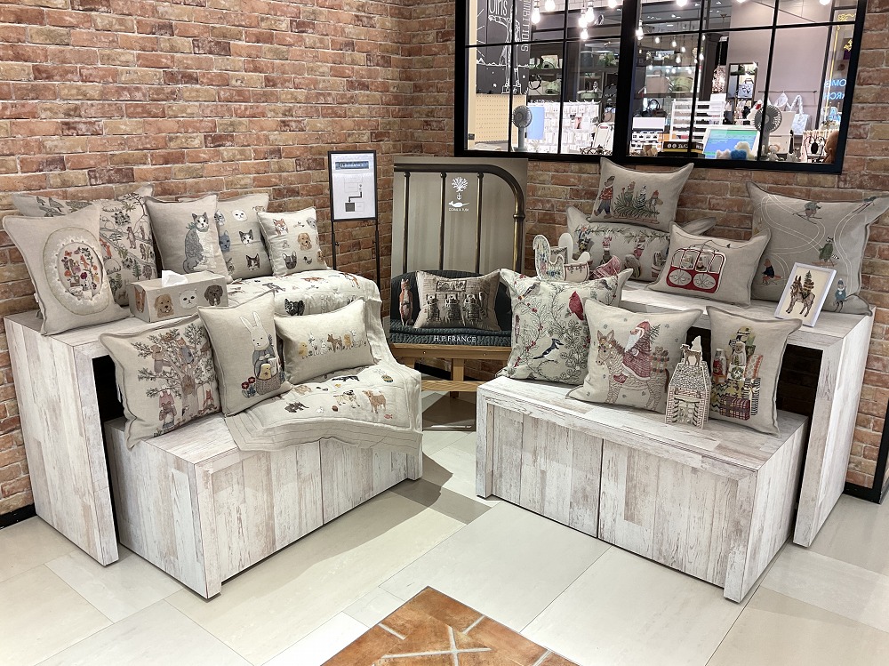 お店に入るとまずお出迎えしてくれるのが【Coral & Tusk(コーラルアンドタスク)】のクッションたちです!