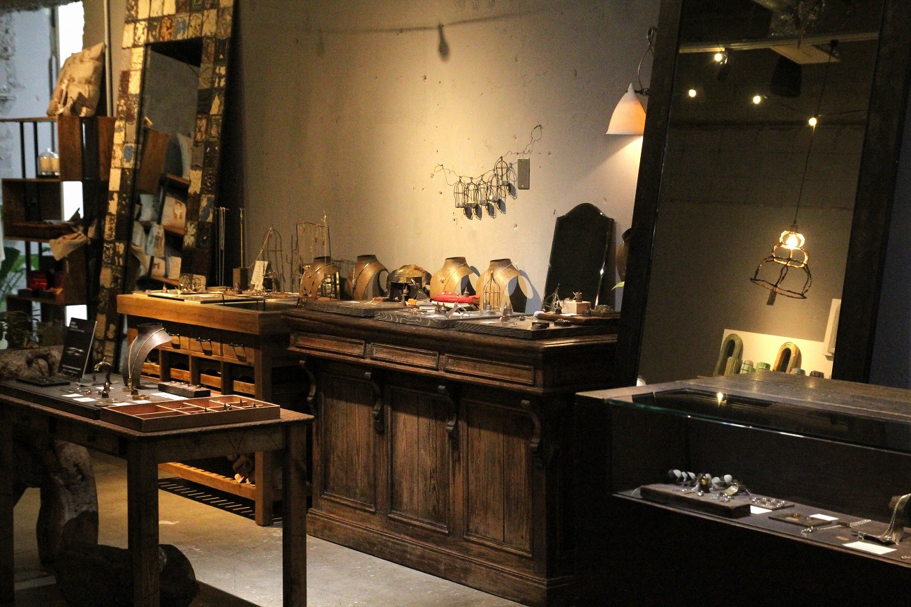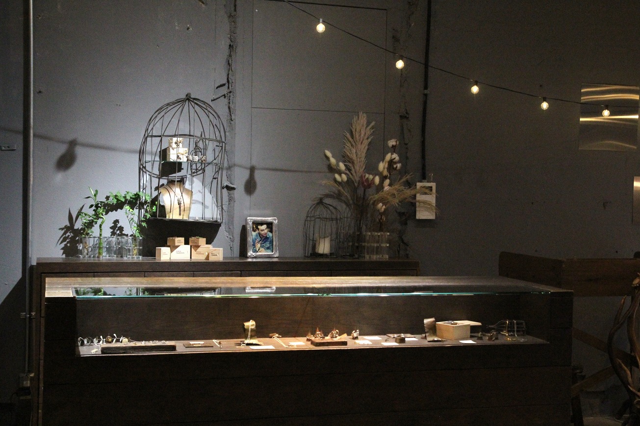 雰囲気のある入口の先には綺麗にディスプレイされたSERGE THORAVALのアクセサリーと、併設されるCAFE CAVE、イベントスペースと開放的な空間が広がっています。