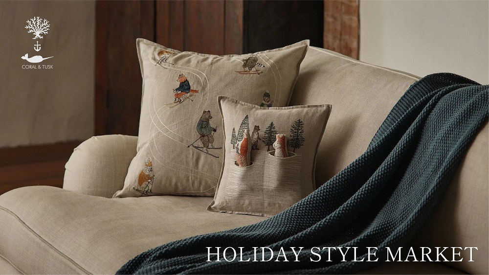 ニューヨーク発のブランドCORAL & TUSK。リネンキャンバスに施された繊細な刺繍は、動物や植物、どこか物語を感じさせるモチーフが印象的。ユーモアと詩情を併せ持つ世界観は、インテリアに自然と溶け込みながら、空間に豊かな表情をもたらします。