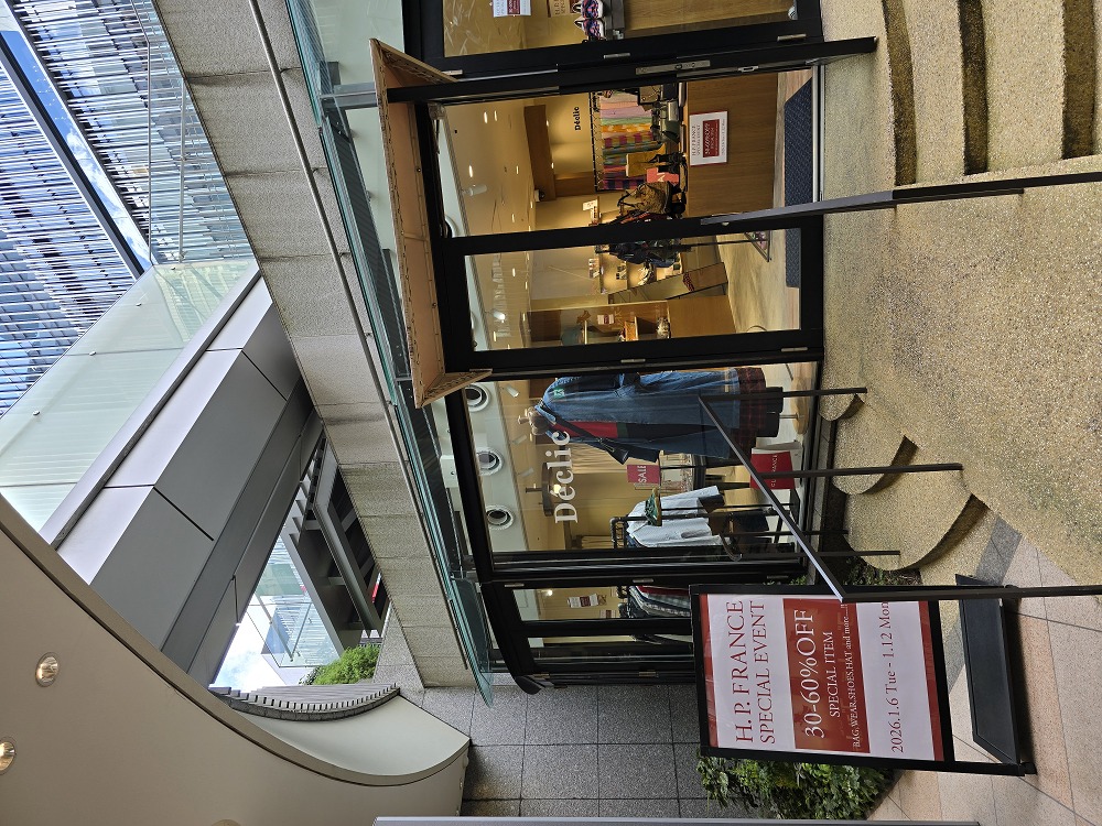 ガラス張りのエントランスが印象的なDéclic大阪店。「H.P.FRANCE SPECIAL EVENT」のサインが掲げられ、期間限定の特別感が!