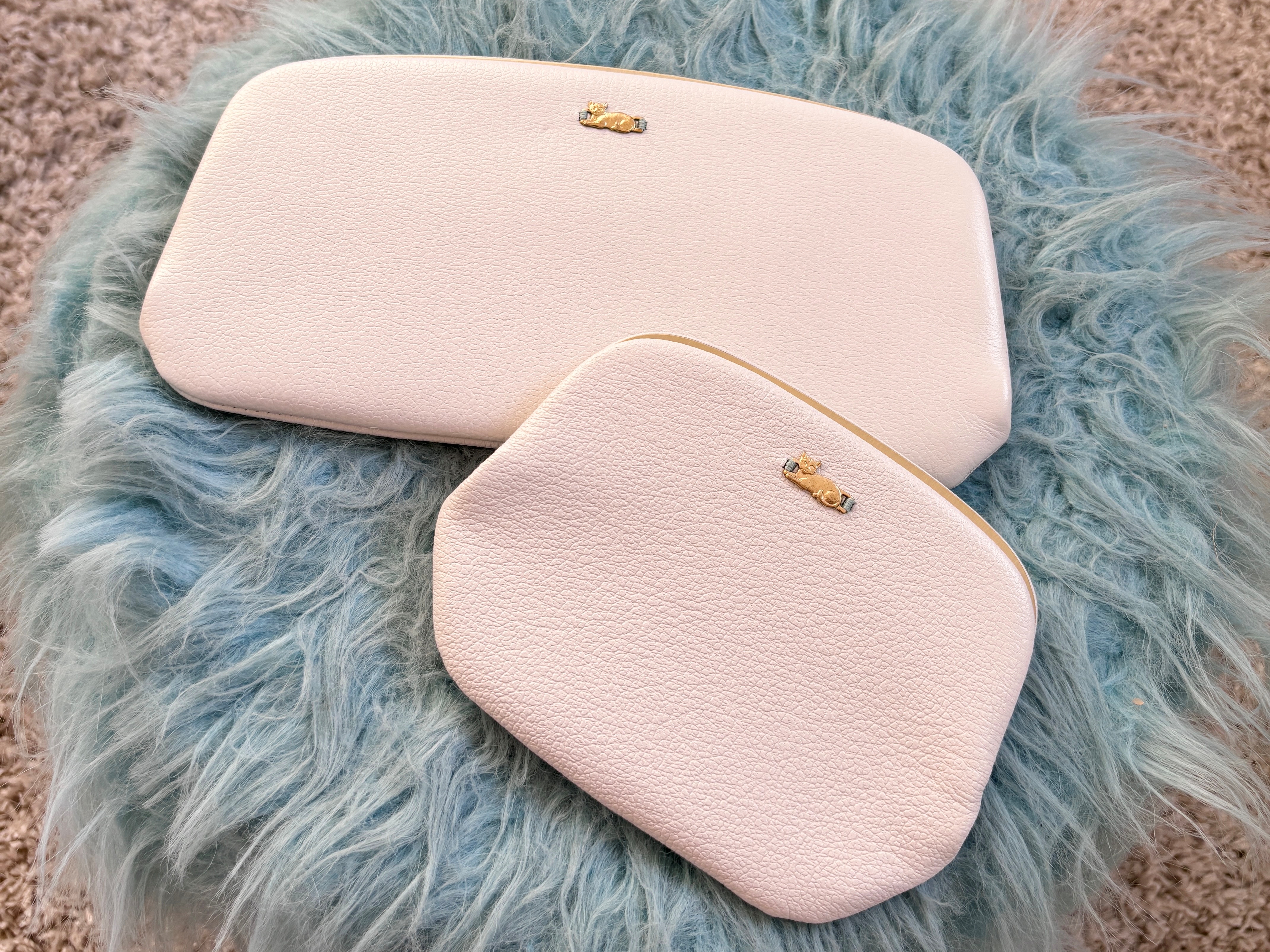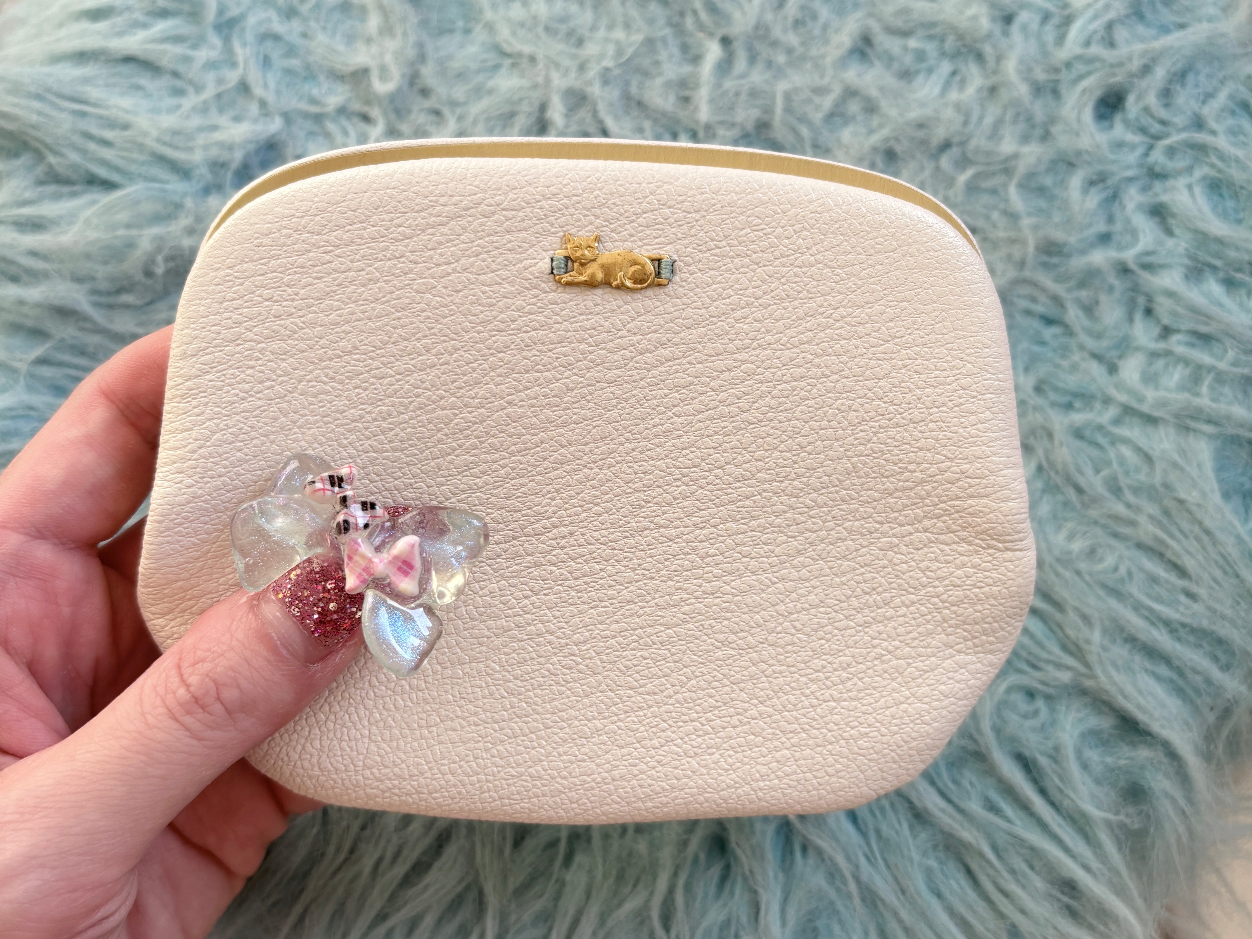 ネコちゃんを留めている刺繍の色がそれぞれ違うのですが、ホワイトと水色、ちらっと見えるゴールドとの組み合わせもかわいい。