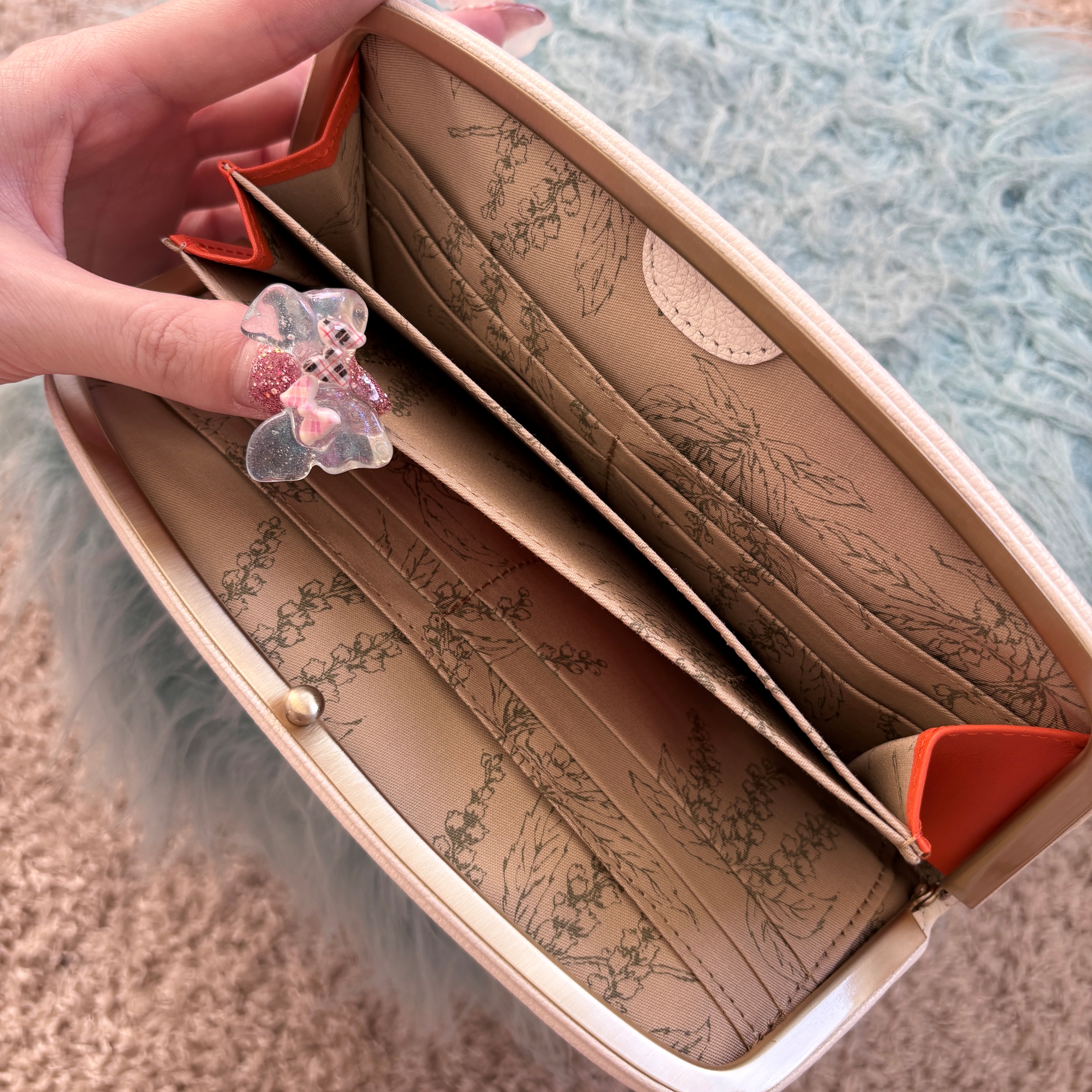 がま口の開閉のためのパーツが内側についているため、かさばらないフラットなフォルムが特徴です。