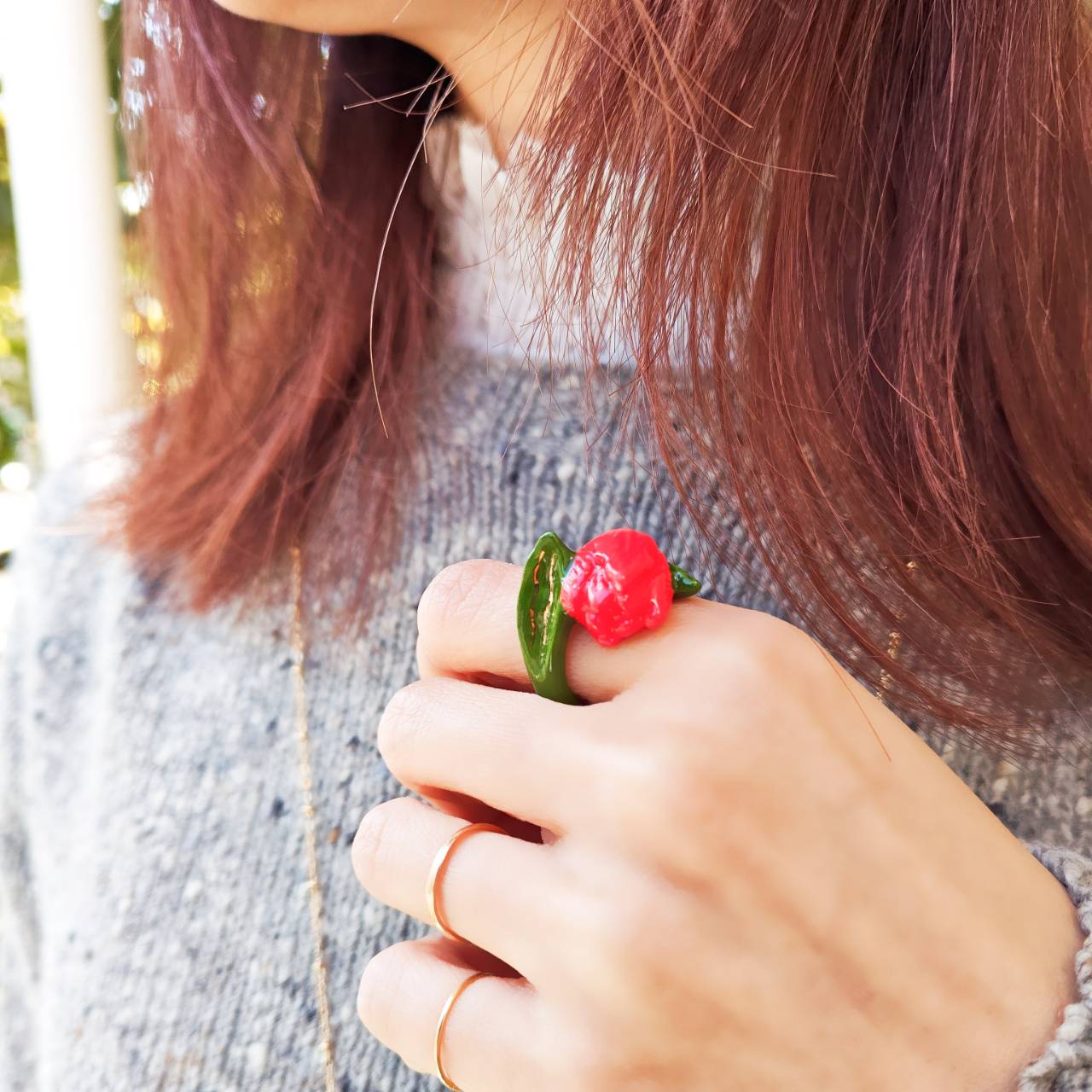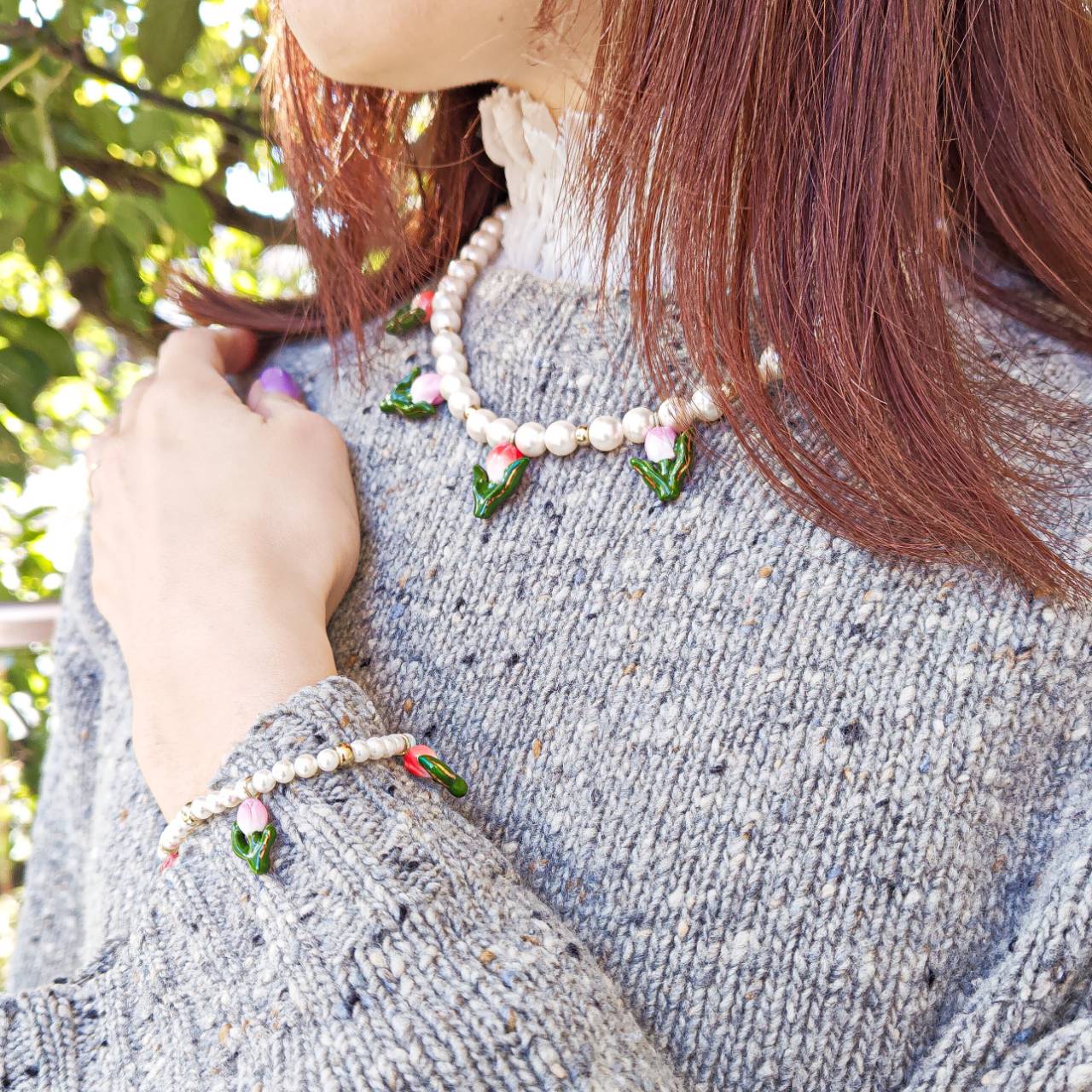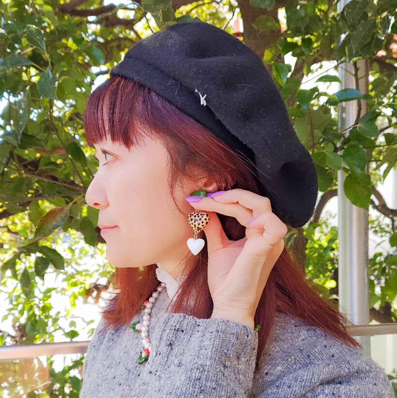今回はメインのチューリップの他に3つのハートモチーフが縦に連なる、印象的なドロップピアスもリリースされました。 艶やかなグリーン、レオパード柄、ホワイトのハートがリズミカルに揺れ、耳元に遊び心と華やかさを添えます。