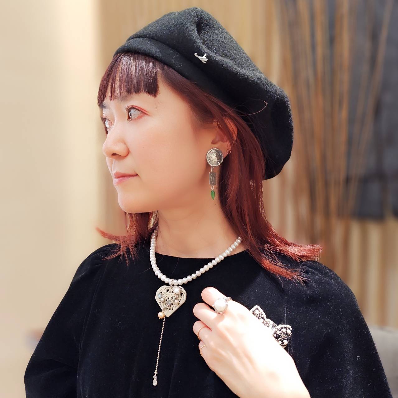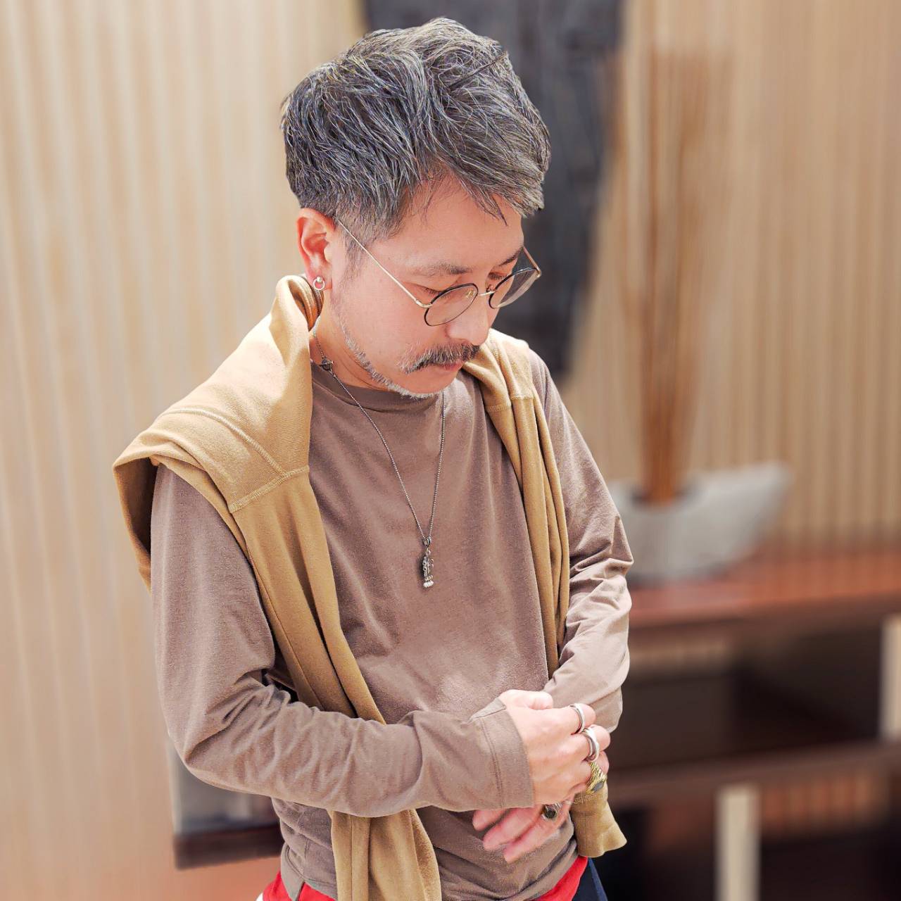 【2026年】二子玉川店に配属されてからは洋服もシンプルで着心地の良いスリードッツのブランドを愛用するようになりました。アクセサリーも映えるようなトップスに変化しました。髪だけでなく眉毛もグレーになってしまい路線変更です。10年の時の流れをgoldieで過ごしてきた証のようなものでしょうか。