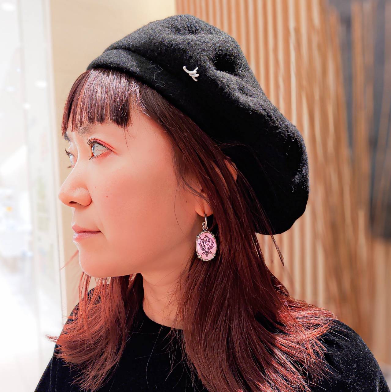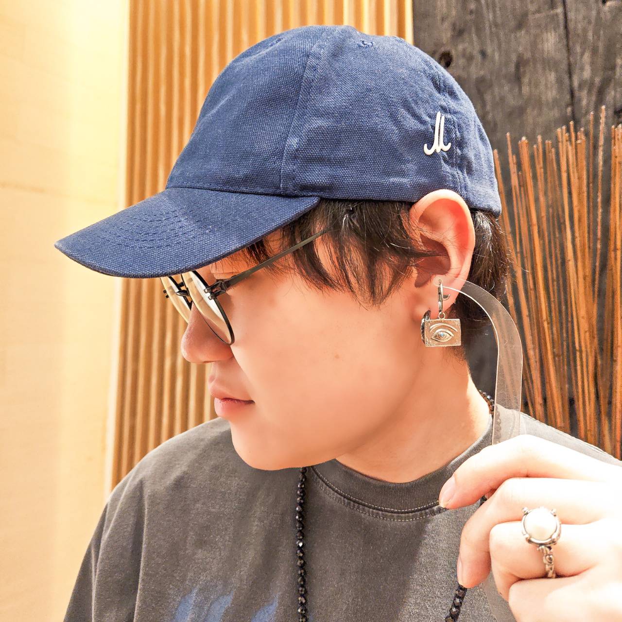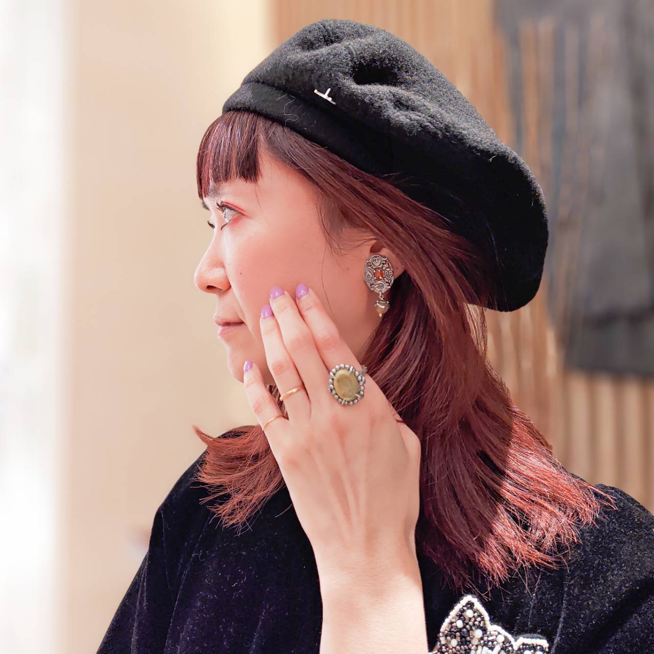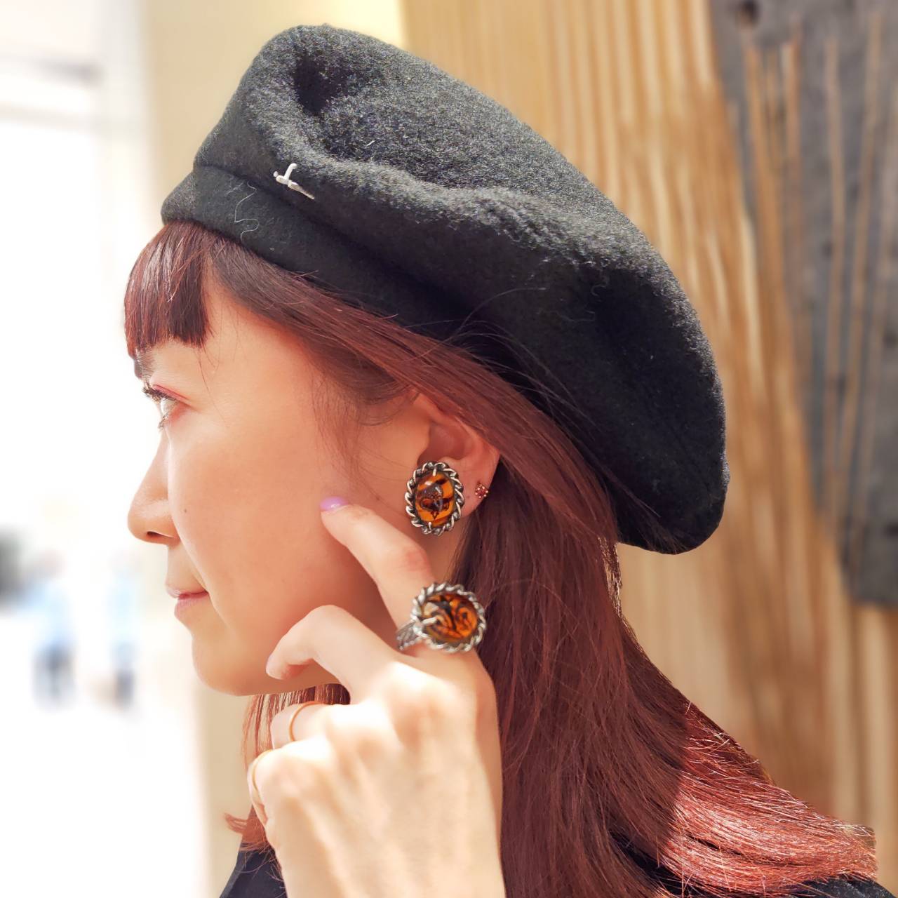 深みのあるアンバーカラーの装飾に、繊細な紋章が浮かび上がるイヤリングとリング。重厚なシルバーはクラシカルな気品を引き立てます。歴史の美しさを現代的に昇華させたデザインともいえるでしょう。顔まわりに知的な佇まいをもたらす、細部まで美意識が貫かれ洗練されたまさに芸術的アクセサリーです。