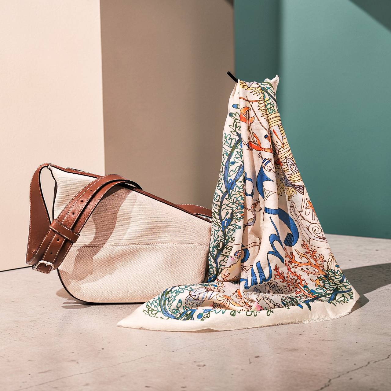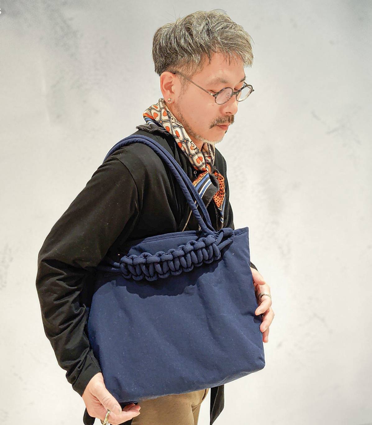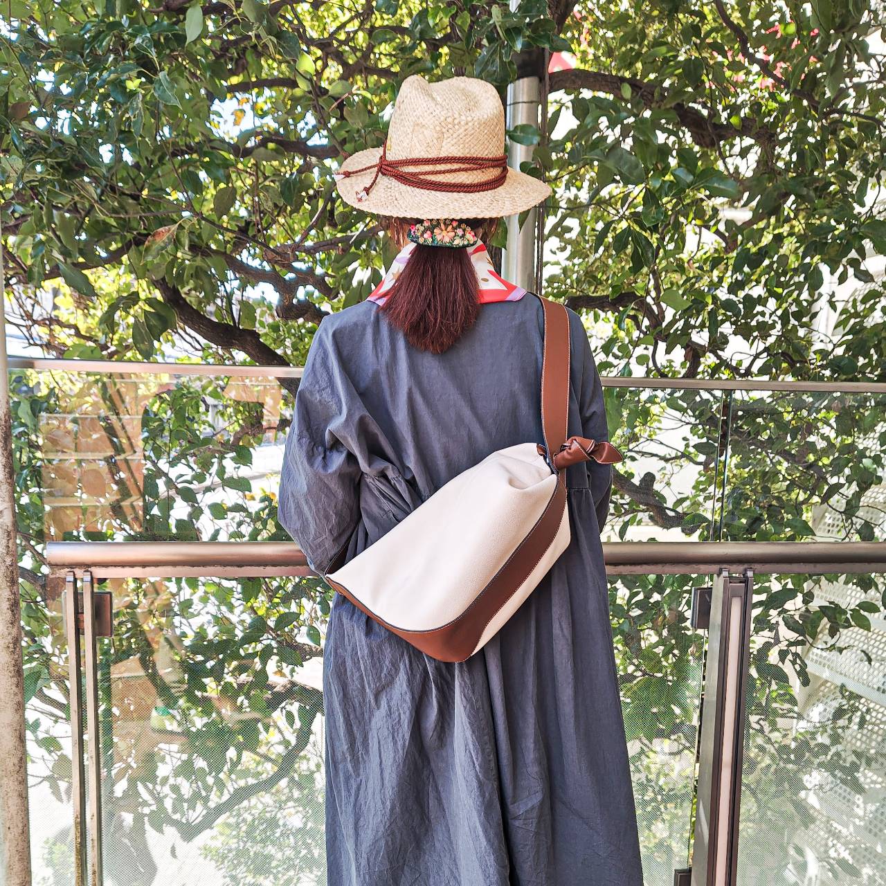 キャンバスがベースにカーフレザーを使用したクロスボディバッグです。トップジップが開閉式で、ショルダーバッグとしてもクロスボディバッグとしても使用可能な汎用性の高いデザインです。日本の伝統的な「風呂敷」の技法に着想を得たデザインからのインスピレーションの素敵なバッグです。