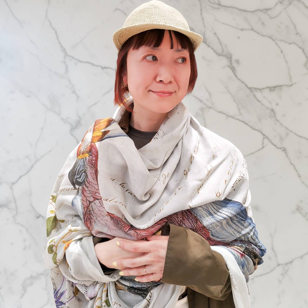 南国にいそうな鳥2 羽が描かれたプリントストール。ベースの色はグレーなので合わせやすく、端に花が描かれているのでエレガントな雰囲気で巻くことができます。広げるとこの芸術性がよく俯瞰できる一枚です。