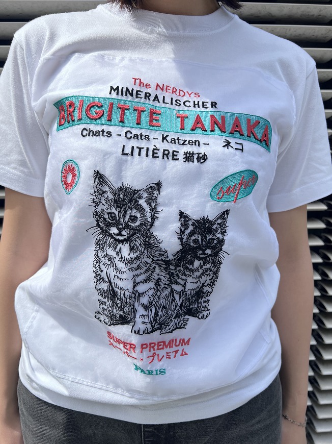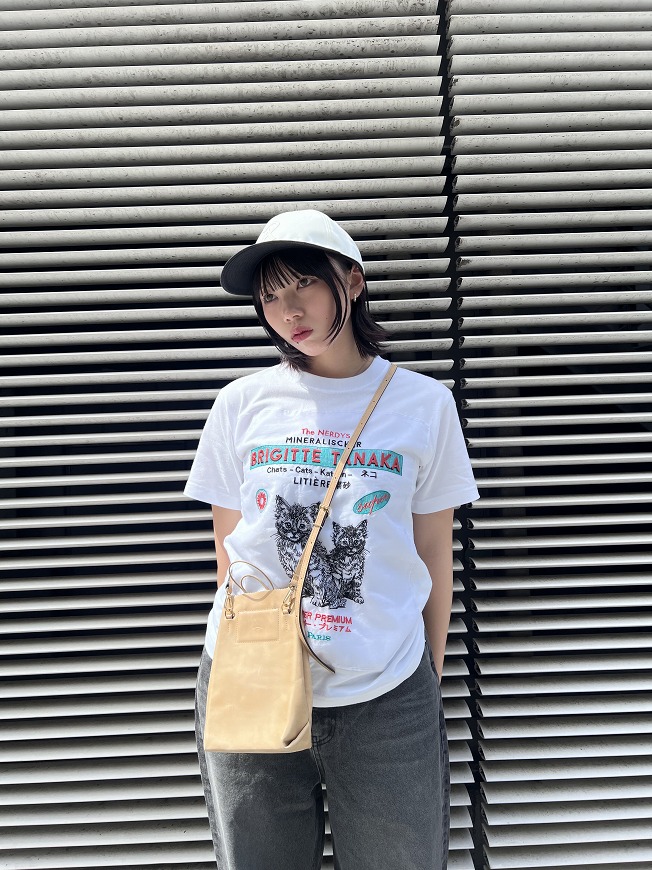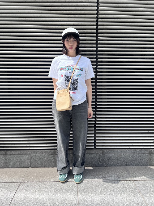 このスタイリングは、キャッチーな猫のTシャツを主役にした、抜け感のあるカジュアルコーデ。
