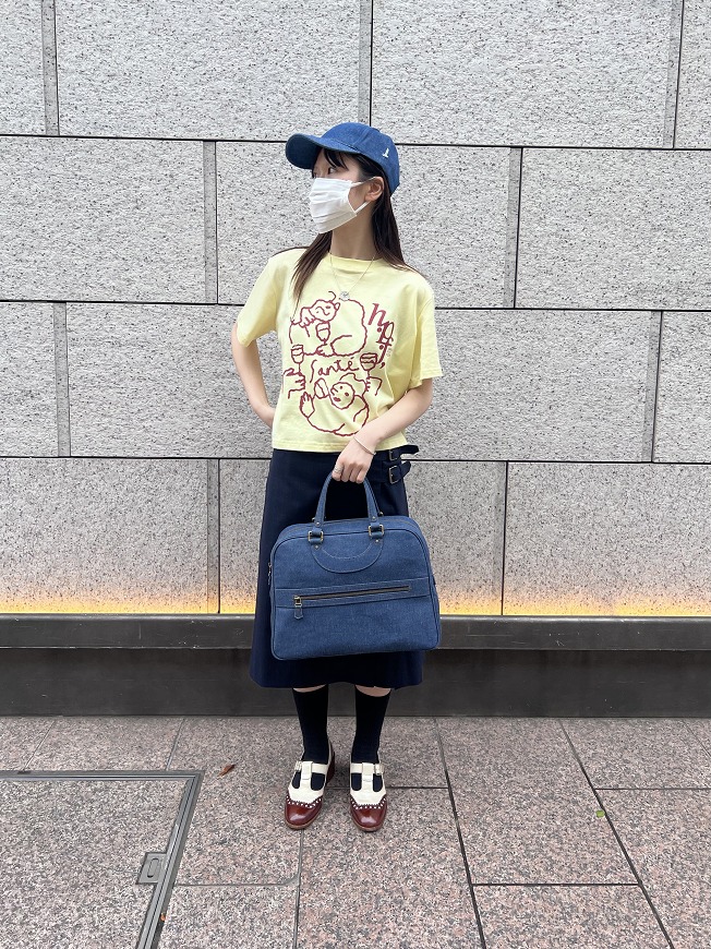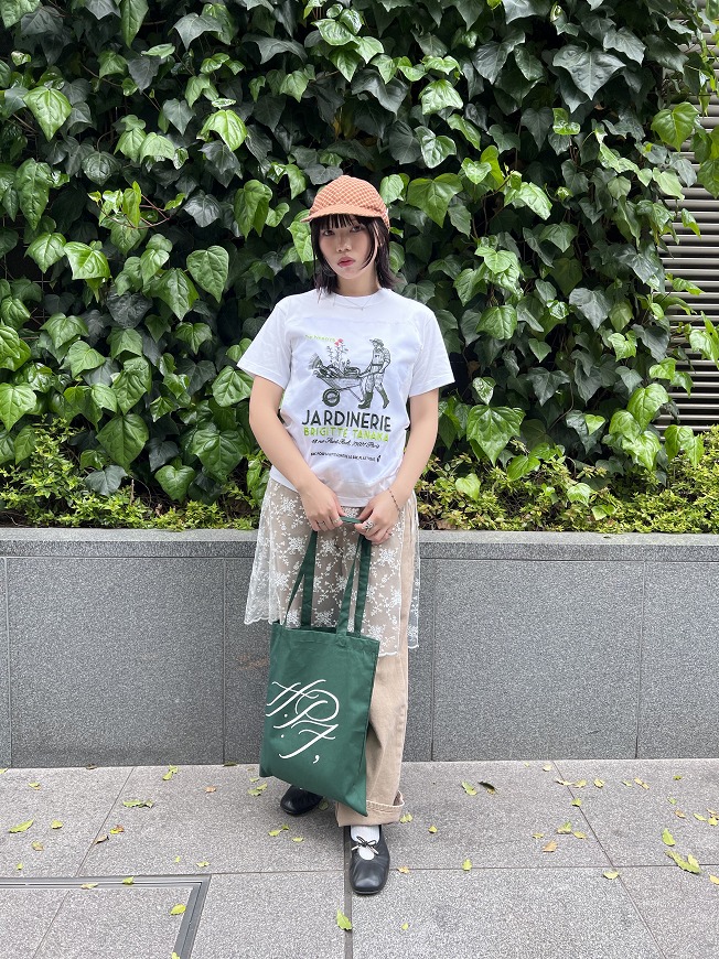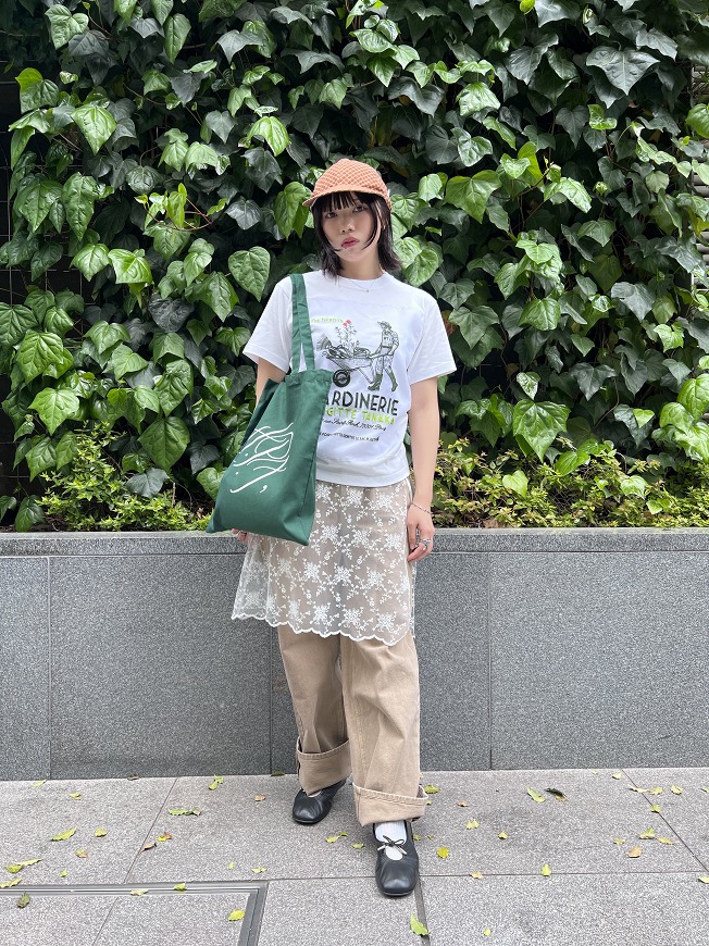 グリーンのトートバッグもアクセントに。Tシャツのグラフィックとリンクするカラーを取り入れることで、さりげないまとまりが生まれています。