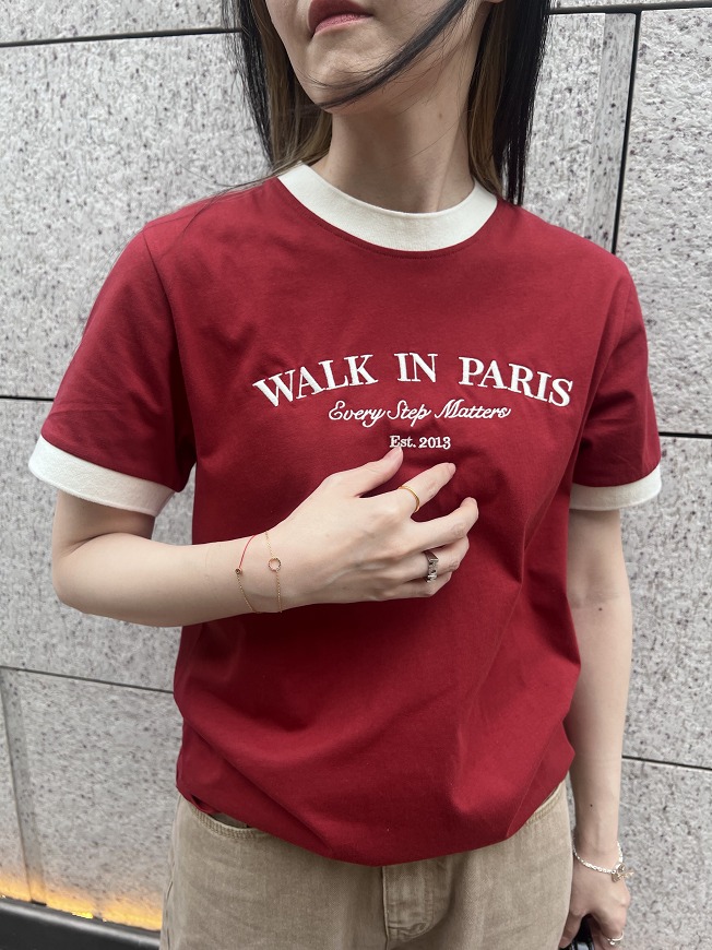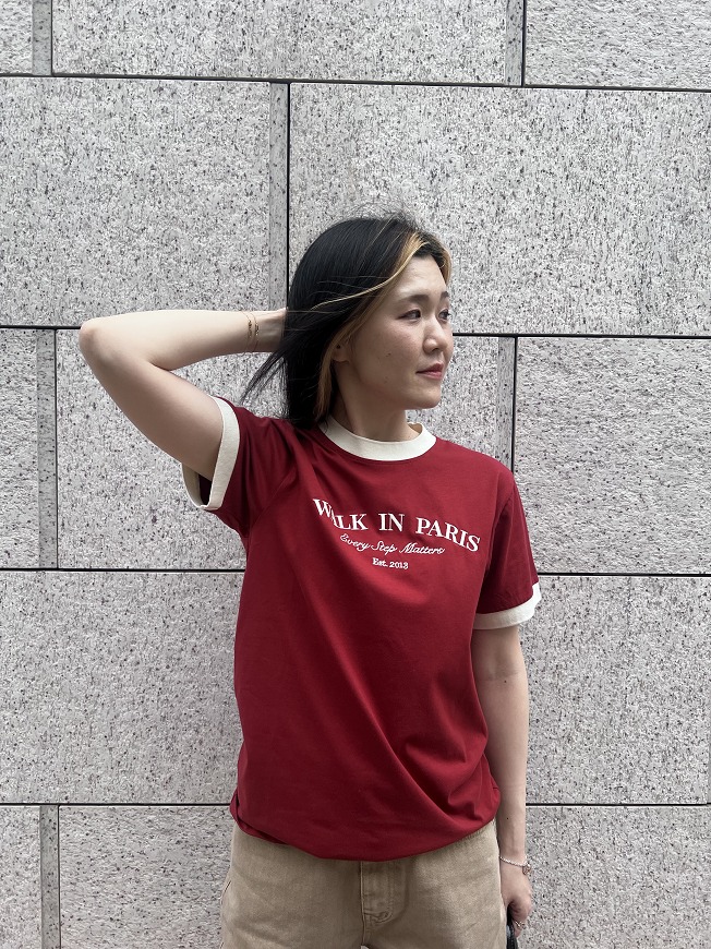 深みのあるレッドに、襟元と袖口の配色が効いたTシャツは、1枚でぐっと雰囲気の出るアイテム。ロゴデザインも相まって、どこかクラシックで上品な印象に仕上がります。