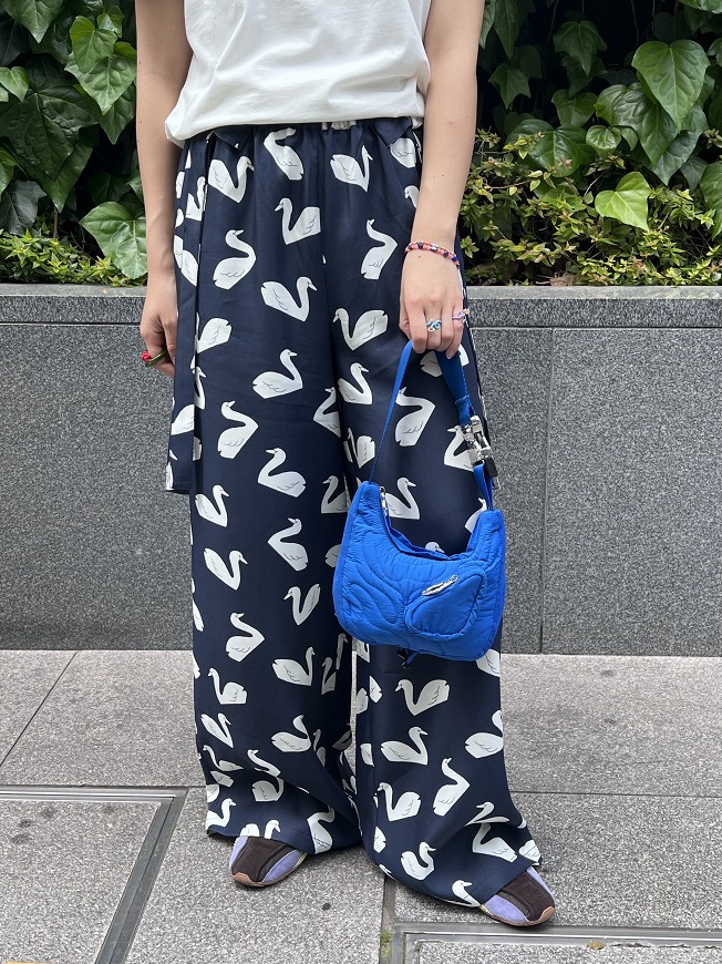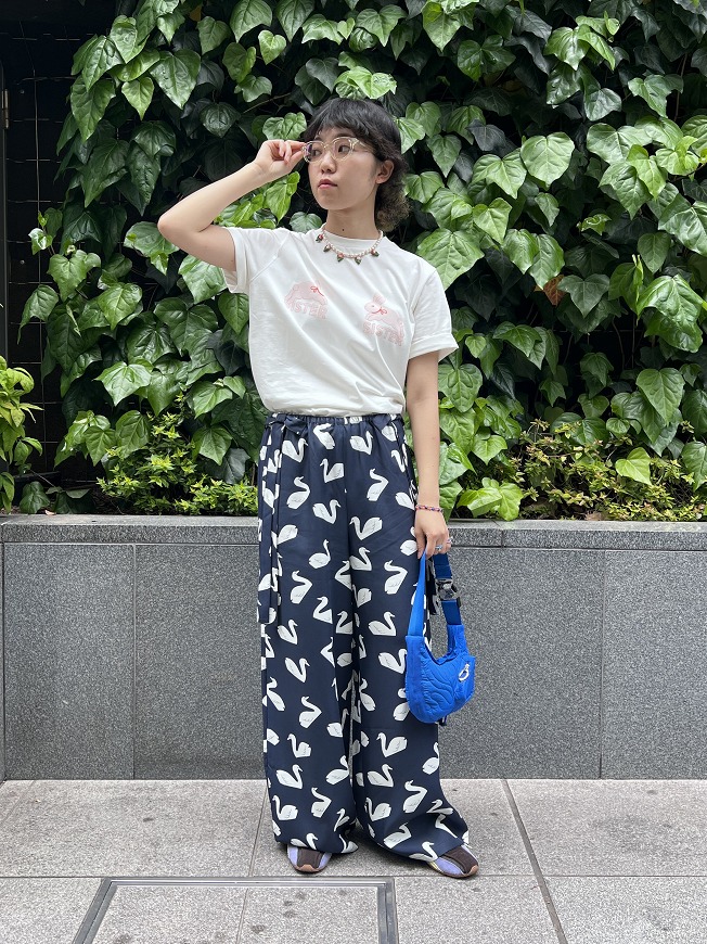 やわらかい印象のグラフィックTシャツに、柄パンツを合わせたスタイル。
