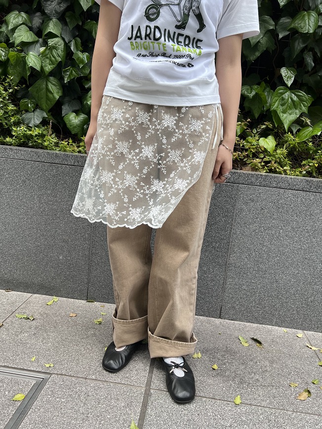ベージュのワイドパンツの上から、繊細なレーススカートを重ねたレイヤードがポイント。カジュアルなパンツスタイルに、ほんのりフェミニンなニュアンスをプラスしてくれます。