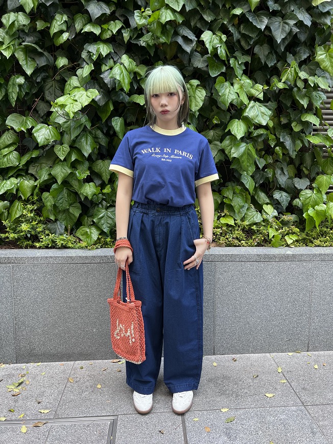 ゆったりとしたデニムを合わせて、リラックス感のあるシルエットに。シンプルな組み合わせながら、Tシャツのデザインがしっかり引き立つバランスです。