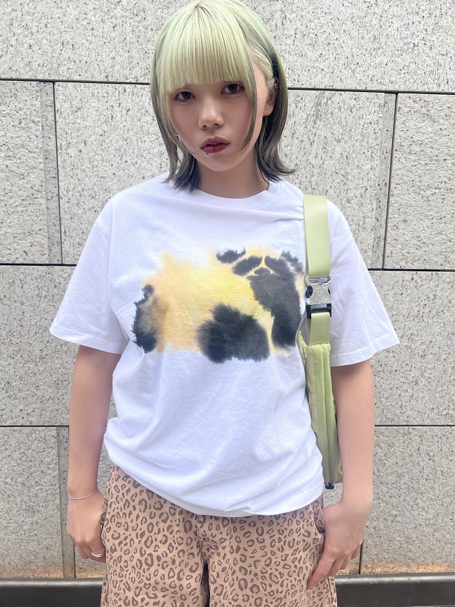抽象的なアートグラフィックTシャツを主役にした、エッジの効いたミックススタイル。やわらかいタッチのプリントながら、存在感のあるデザインがコーディネートにしっかり個性をプラスしてくれます。