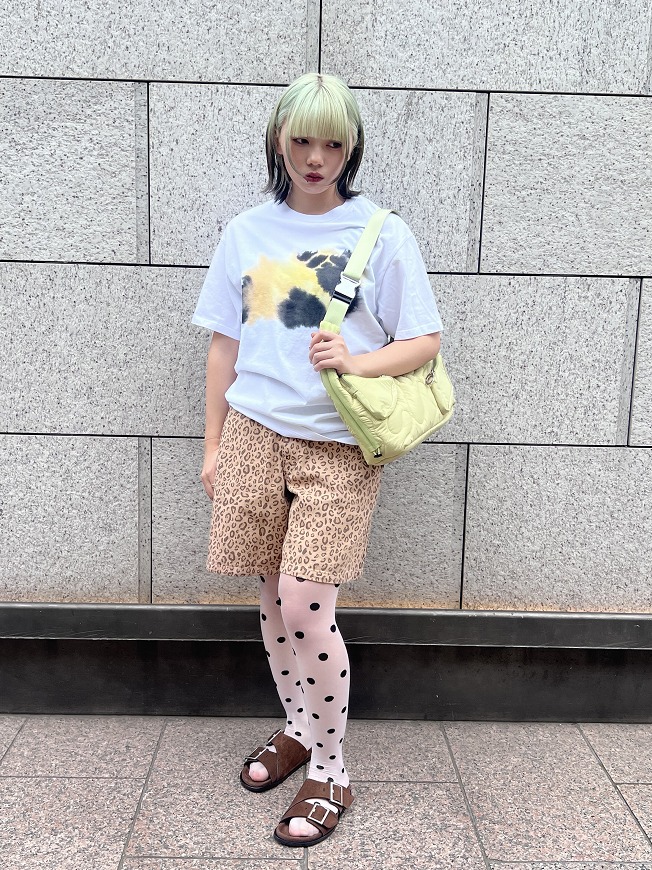 さらに、ドット柄のタイツをレイヤードすることで、柄×柄の上級者コーデに。シンプルな白Tをベースにすることで、全体がまとまりやすくなっています。足元はサンダルで抜け感を出しつつ、軽やかな印象に。
