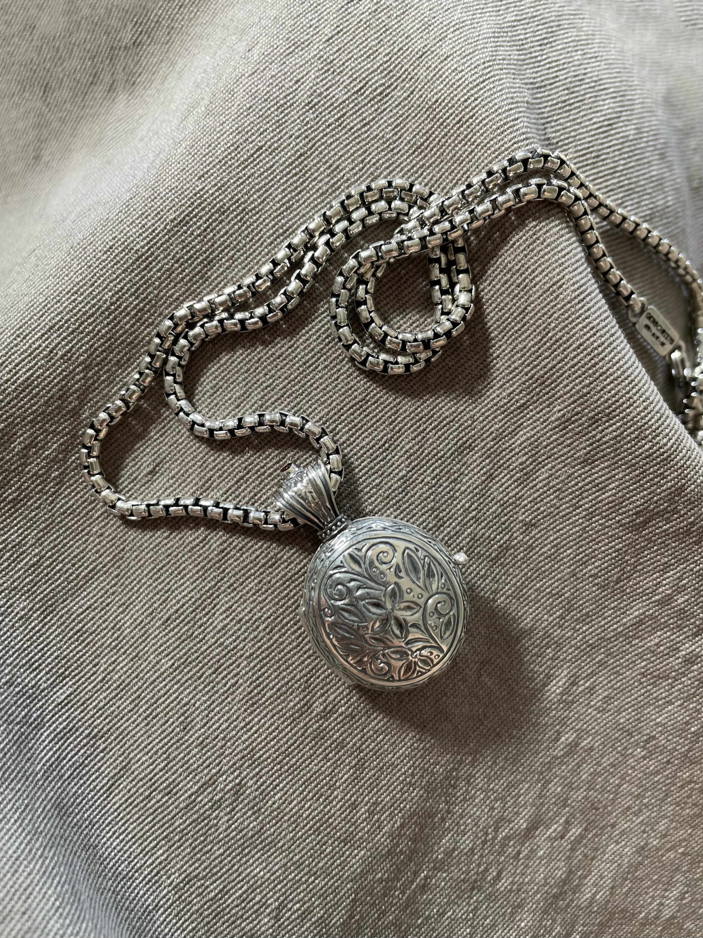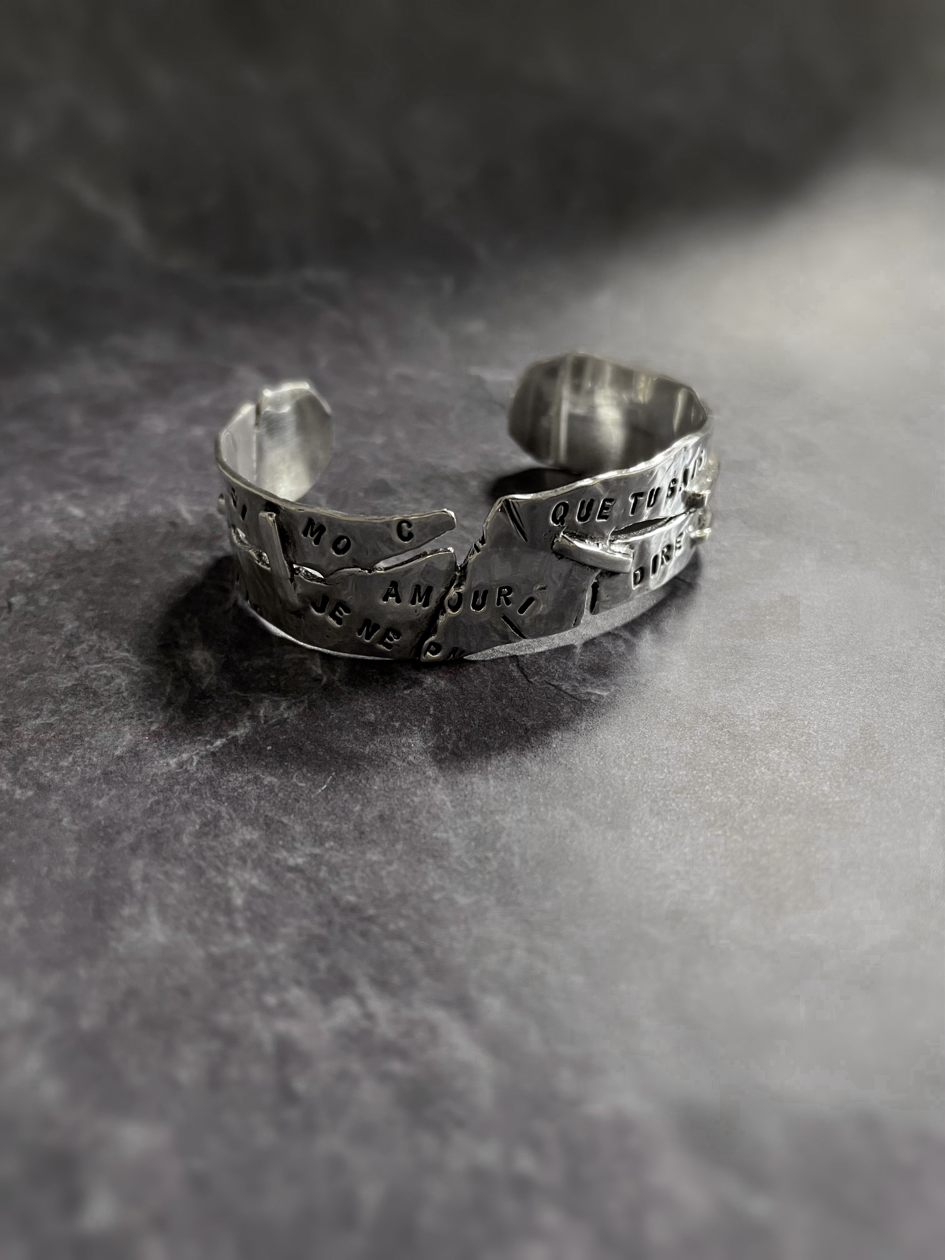 スターリングシルバーやゴールドに、フランス語でメッセージや詩を刻み込んだデザインは、手仕事のぬくもりを感じさせ、長年多くの人に愛され続けています。