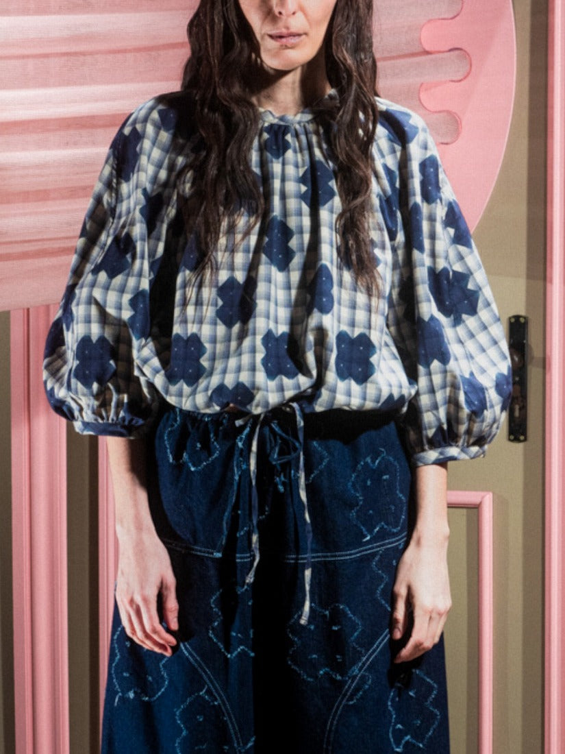 color:Blue White Checks Cross Print