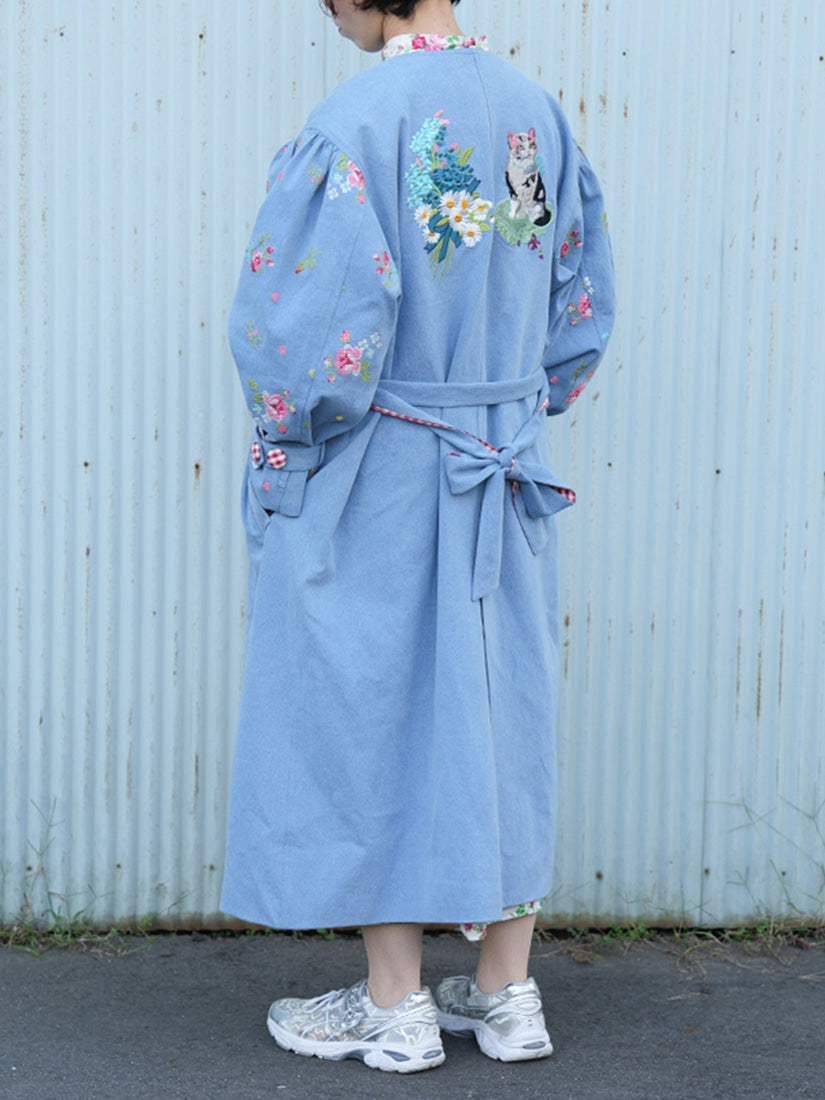 後ろにはアンティーク風の猫ちゃんと花束の刺繍、袖にはクロスステッチのお花が施されています!