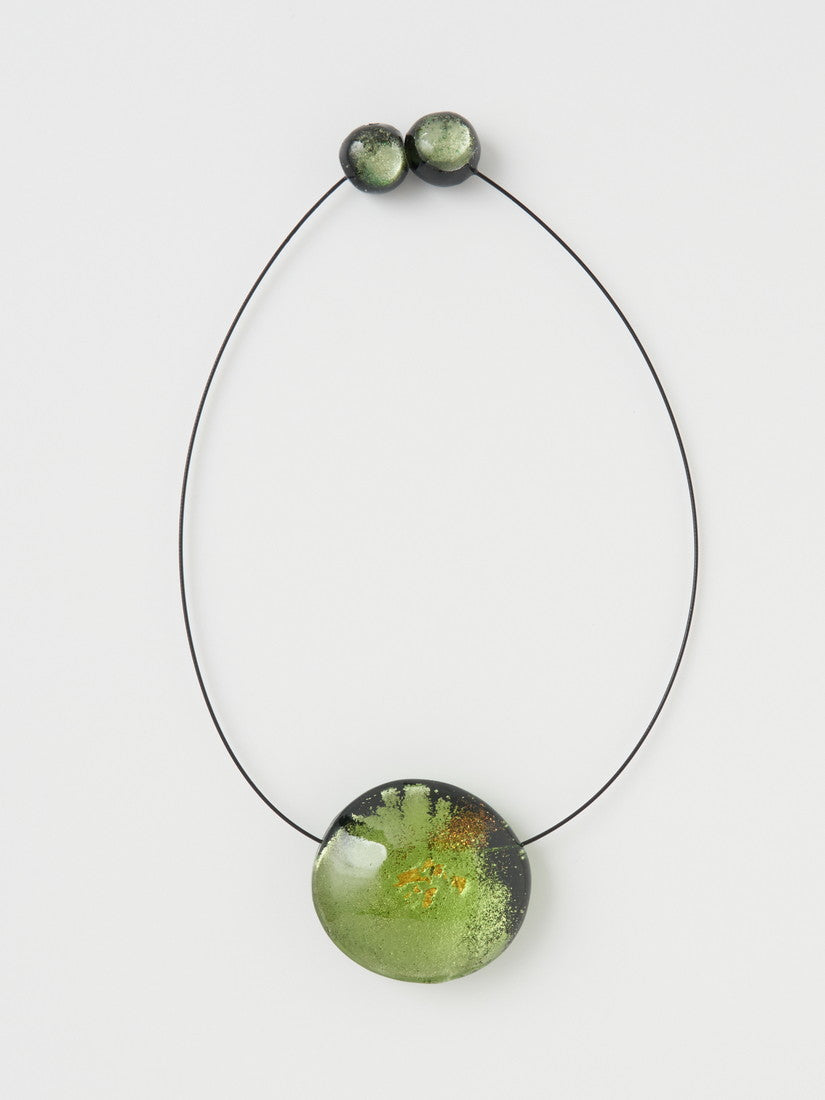 ストールとカラーを合わせて、グリーンが綺麗な大ぶりのワントップネックレス。