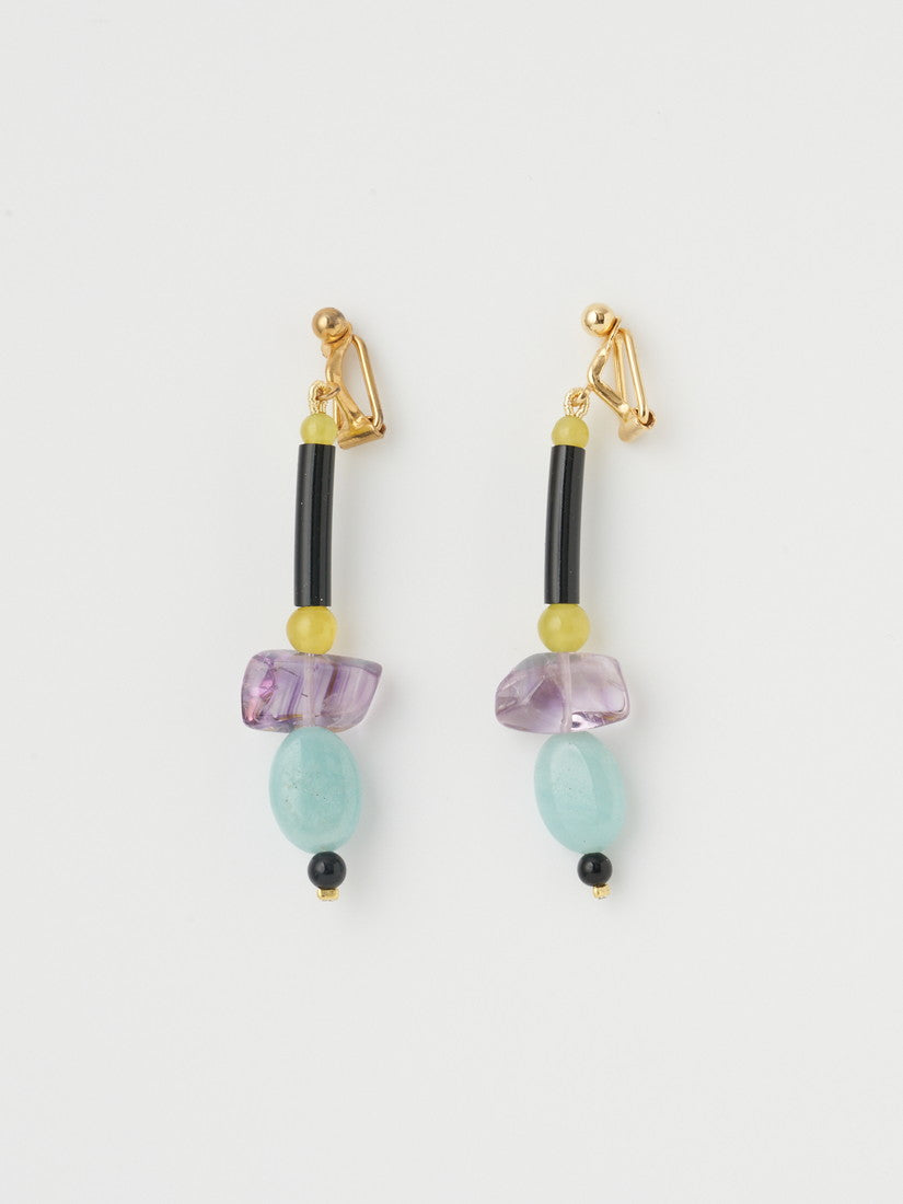 爽やかな色合いのなか、シーバンブーの赤がアクセントとなった細みのロングネックレスとイヤリングでまとめて👍