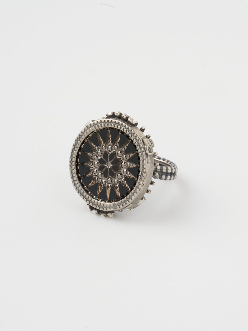 右手につけている黒いガラスのリングはガラスを削ってデザインされているので暗くなりがちなコーディネートの中でもキラキラと輝いてくれます。