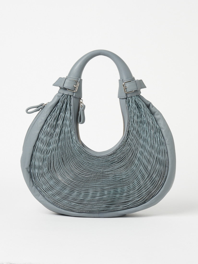 bag ¥129,800(Mariana Mendez) ブルーグレーが美しいバッグは、 マリアナメンデスならではのエラスティックコードが主役になったデザイン。
