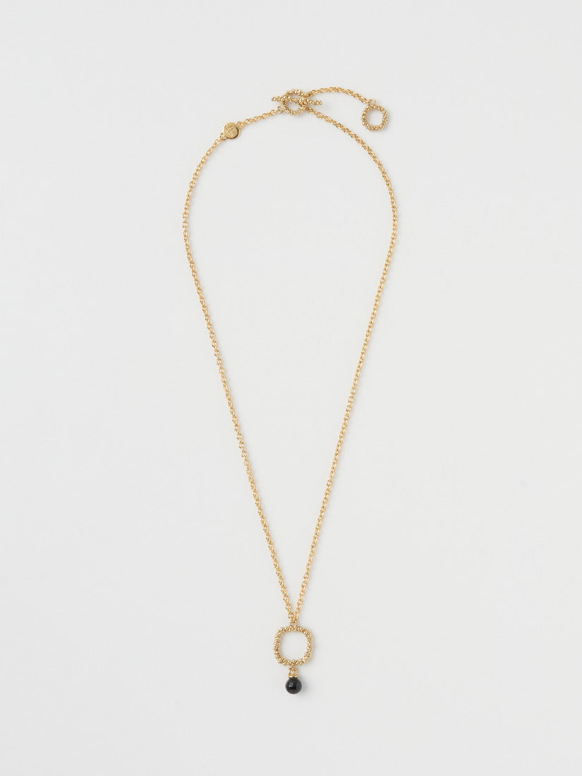 六角形のメタルパーツがアクセントになったロングネックレスに、オニキスのボールがアクセントになったショートネックレスを重ね付け!