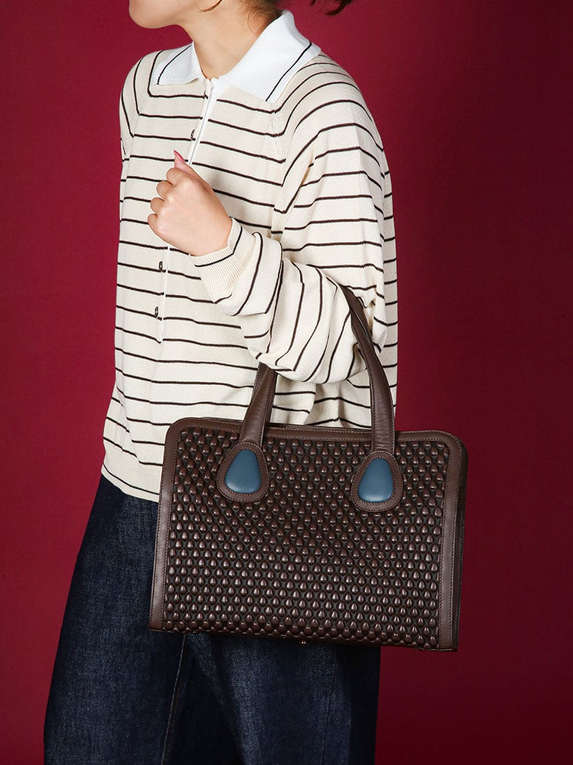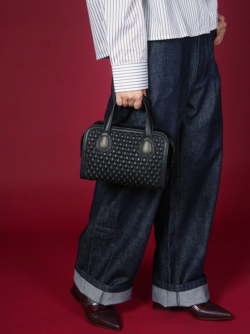 このドット型のエンボスの特殊な加工をレザーに施すことにより華やかで重厚感が感じられ、リッチな見た目ながらも非常に軽くて滑らかな質感を併せ持つという素晴らしい作品に仕上がっています。