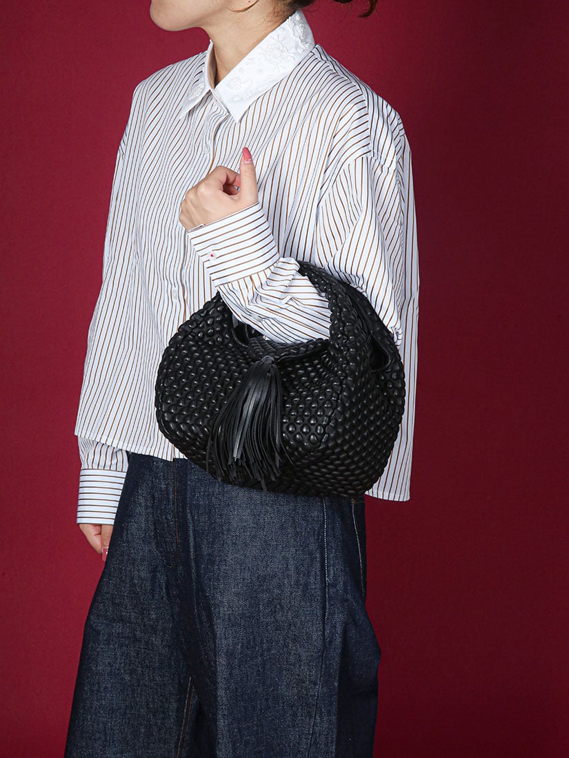 ベルベットのよう柔らかなスペイン産のラムスキンを使い、何世代にもわたる皮なめしの技術を持つ熟練した職人たちの手により、一枚一枚手作業で仕上げる複雑な蒸しの工程によって作られる「バブル」レザーを使用した高級感のあるバッグです。