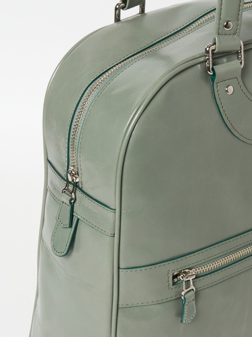やわらかな光沢をまとった上質なポリッシュドレザーを使用し、構築的なシルエットで洗練された印象に。収納力がありながらもすっきりとした佇まいです。