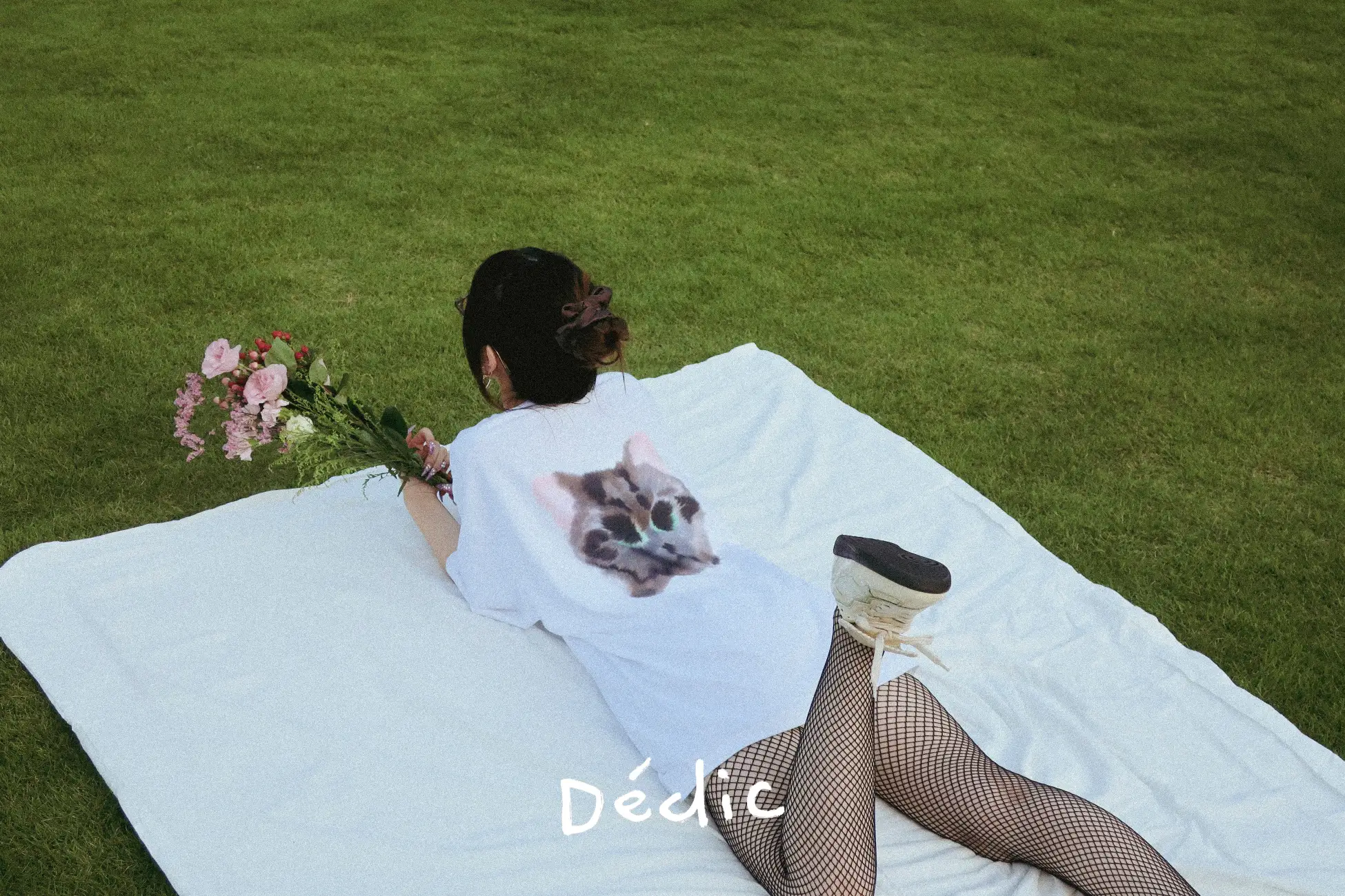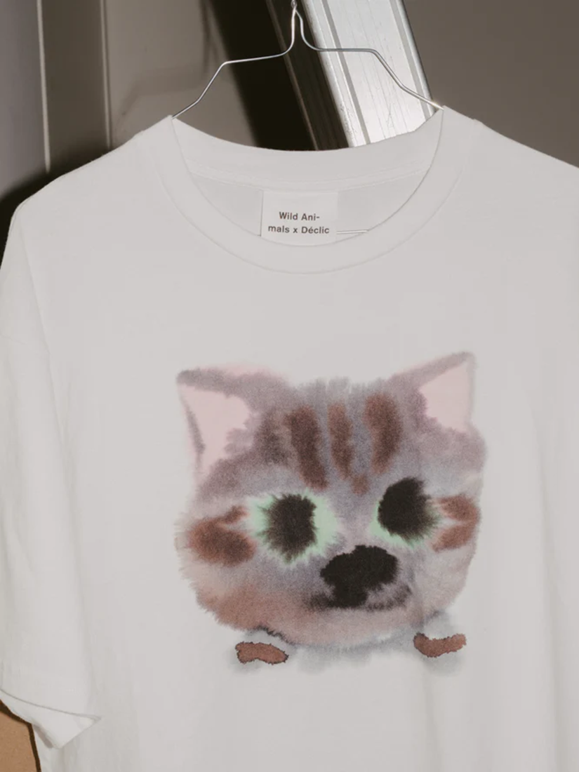 今回の「Cat Face」Tシャツは、「デクリック」の1周年を記念して生まれた特別なコラボレーションアイテム。素朴でユーモラスに描かれた“猫の顔”をフロントとバックに配したデザインは、「ワイルド アニマルズ」らしい自由な筆致をそのままに、アートピースを日常に取り入れられる一枚に仕上がりました。また、内タグには「Wild Animals × Déclic」のロゴがプリントされており、通常展開にはない、1周年のために制作された特別仕様のディテールとなっています。